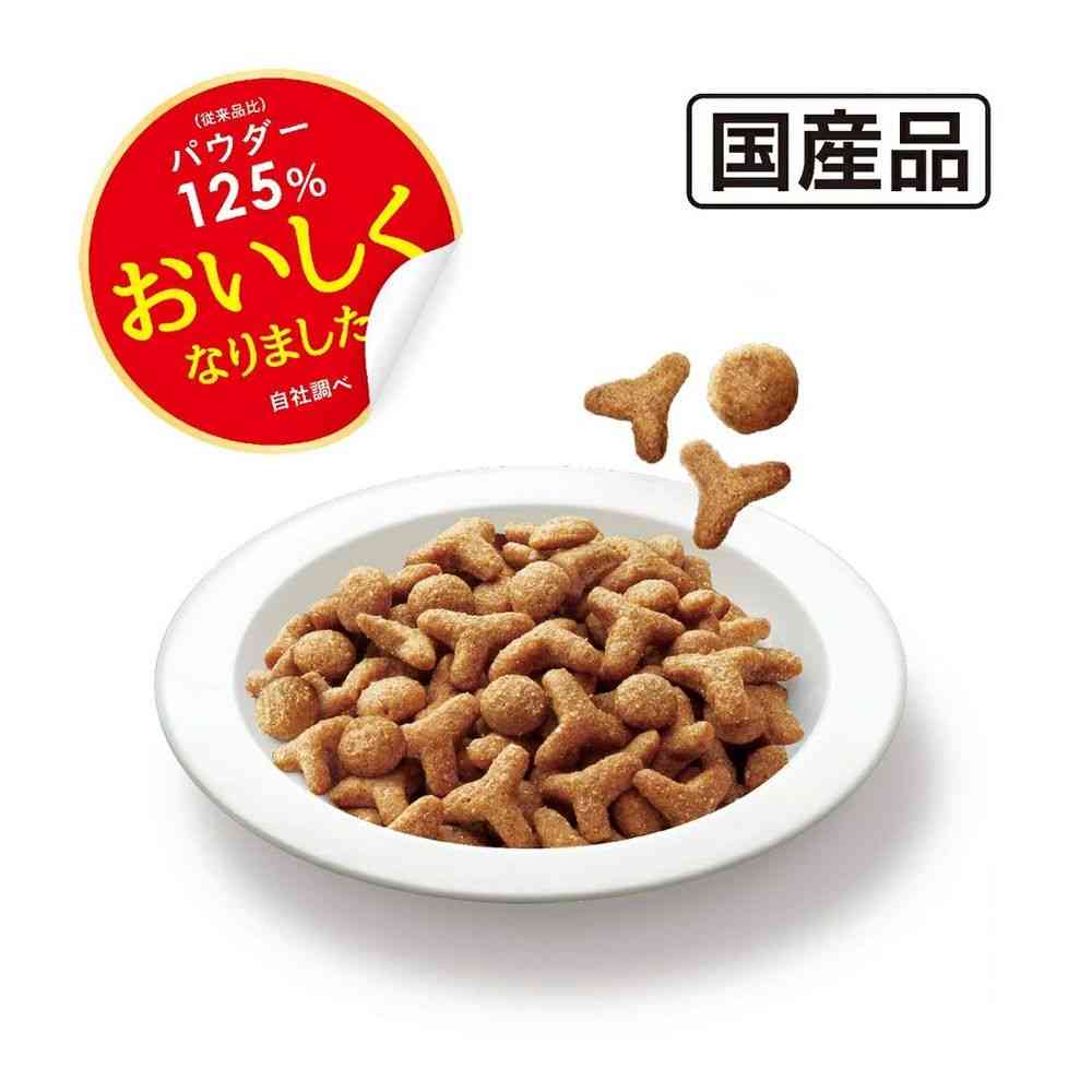 穀類(とうもろこし、コーングルテンミール)、肉類(ミートミール、チキンミール、チキンレバーパウダー)、豆類(おから)、油脂類(動物性油脂)、セルロース:食物繊維源、魚介類(フィッシュミール、フィッシュエキス)、糖類(フラクトオリゴ糖)、シャンピニオンエキス、セレン酵母、ビタミン類(A、D3、E、K3、B1、B2、パントテン酸、ナイアシン、B6、葉酸、ビオチン、B12、コリン、イノシトール)、ミネラル類(カルシウム、リン、ナトリウム、カリウム、塩素、鉄、コバルト、銅、マンガン、亜鉛、ヨウ素)、アミノ酸類(メチオニン、トリプトファン、タウリン)、酸化防止剤(ローズマリー抽出物、ミックストコフェロール)