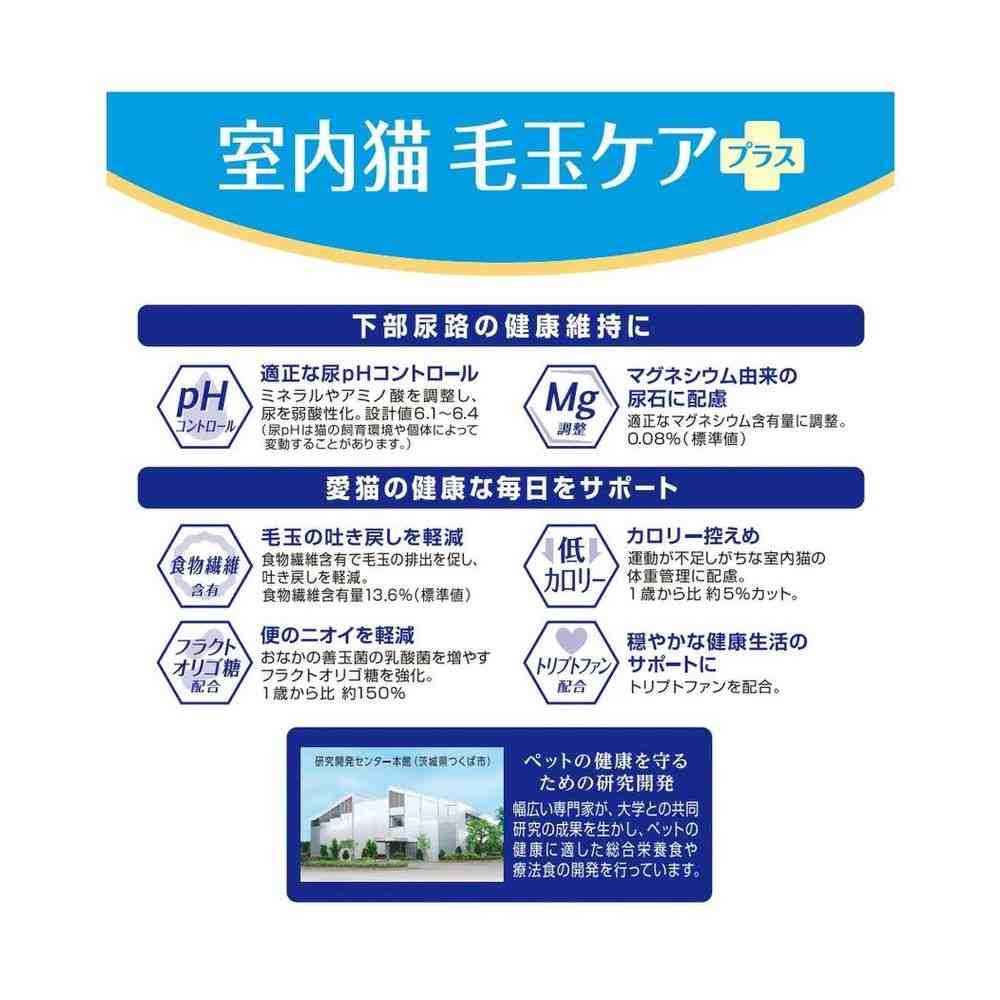 マグネシウム由来の尿石に配慮。 毛玉排出のサポートにセルロース(食物繊維源)をプラス。 カロリー控えめ(1歳から比約5%カット)。 ◎尿pH設計値6.1~6.4◎マグネシウム含有量0.08%(標準値)