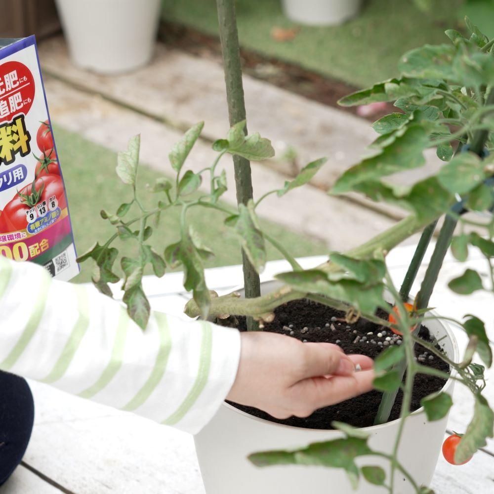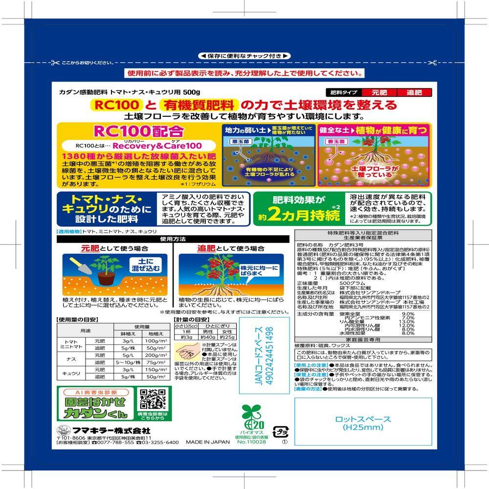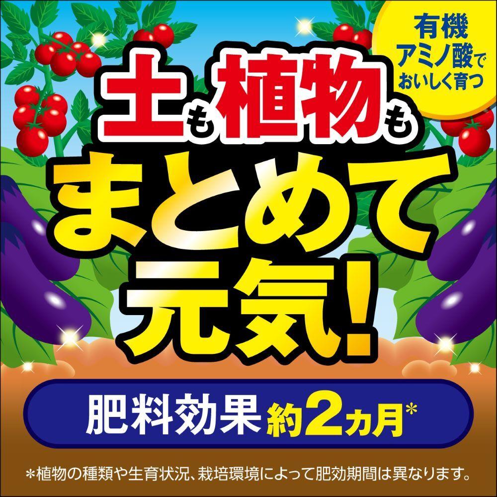 ●植物が育ちやすい土壌環境に! 放線菌入りたい肥 RC100 を配合しています。 ●トマト・キュウリ・ナスのために設計した肥料! アミノ酸入り肥料でおいしく、たくさん収穫でき、元肥にも追肥にも使いやすい肥料です。 ●肥料効果が約 2 ヵ月持続*! 緩効性肥料が配合されているからゆっくり肥料成分を溶出します。 *植物の種類や生育状況、栽培環境によっては肥効期間は異なります。