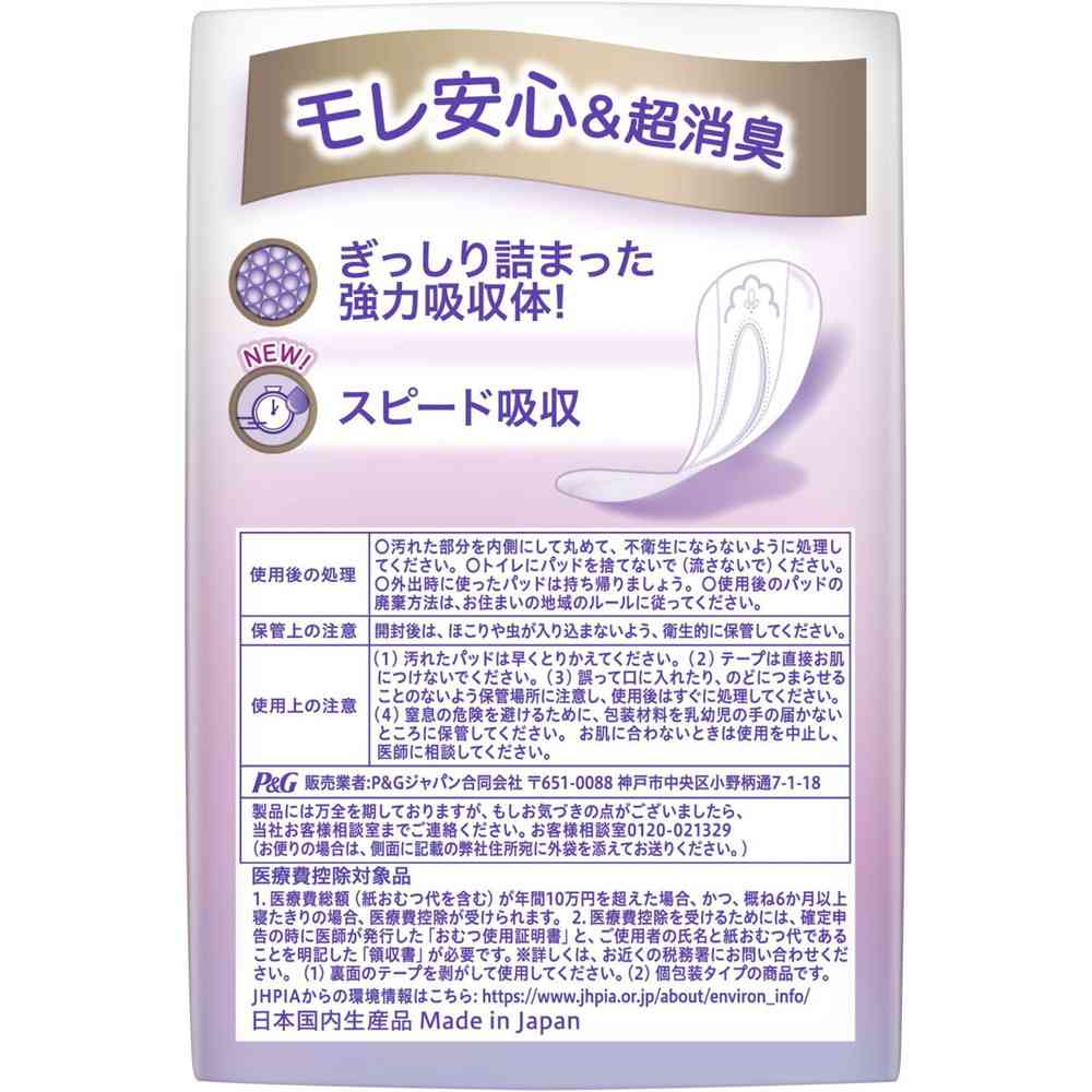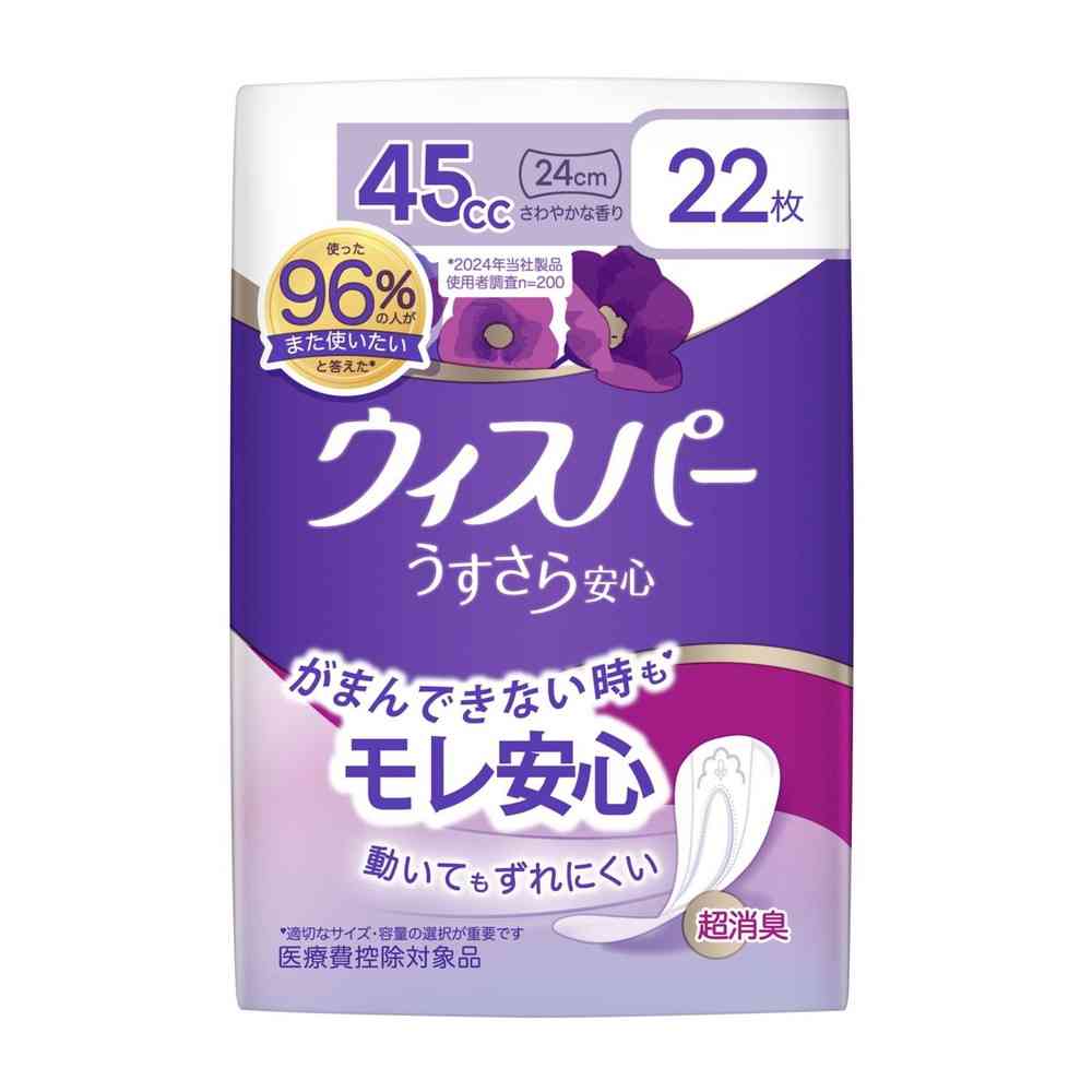 「ウィスパー うすさら安心 女性用 吸水ケア 45cc 快適の中量用 ナプキン型尿ケアパッド 22枚入り 24cm (中量の尿モレ用)」は、 ぬれてもスリムシートで、モレ・ぬれ感・においを防ぎます。 超スピード消臭技術で吸水後のにおいもすぐに消臭し、吸水後もスリムシートでうすくてさらさら。 横モレ防止ギャザーが、横モレをしっかりガードするから安心です。