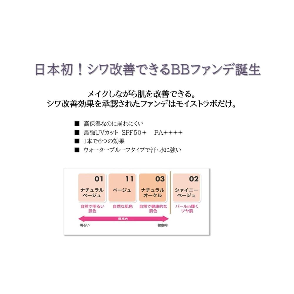 メイクしながらシワ改善 伸びがよく超うるおう シミ・くすみ・毛穴をカバーしツヤ肌に 高保湿力なのにメイクが崩れにくい。美容液成分を贅沢配合。 最強UVカット SPF50+ PA++++ ウォータープルーフタイプで汗・水に強い 1本6役。これ1本でベースメイク完了