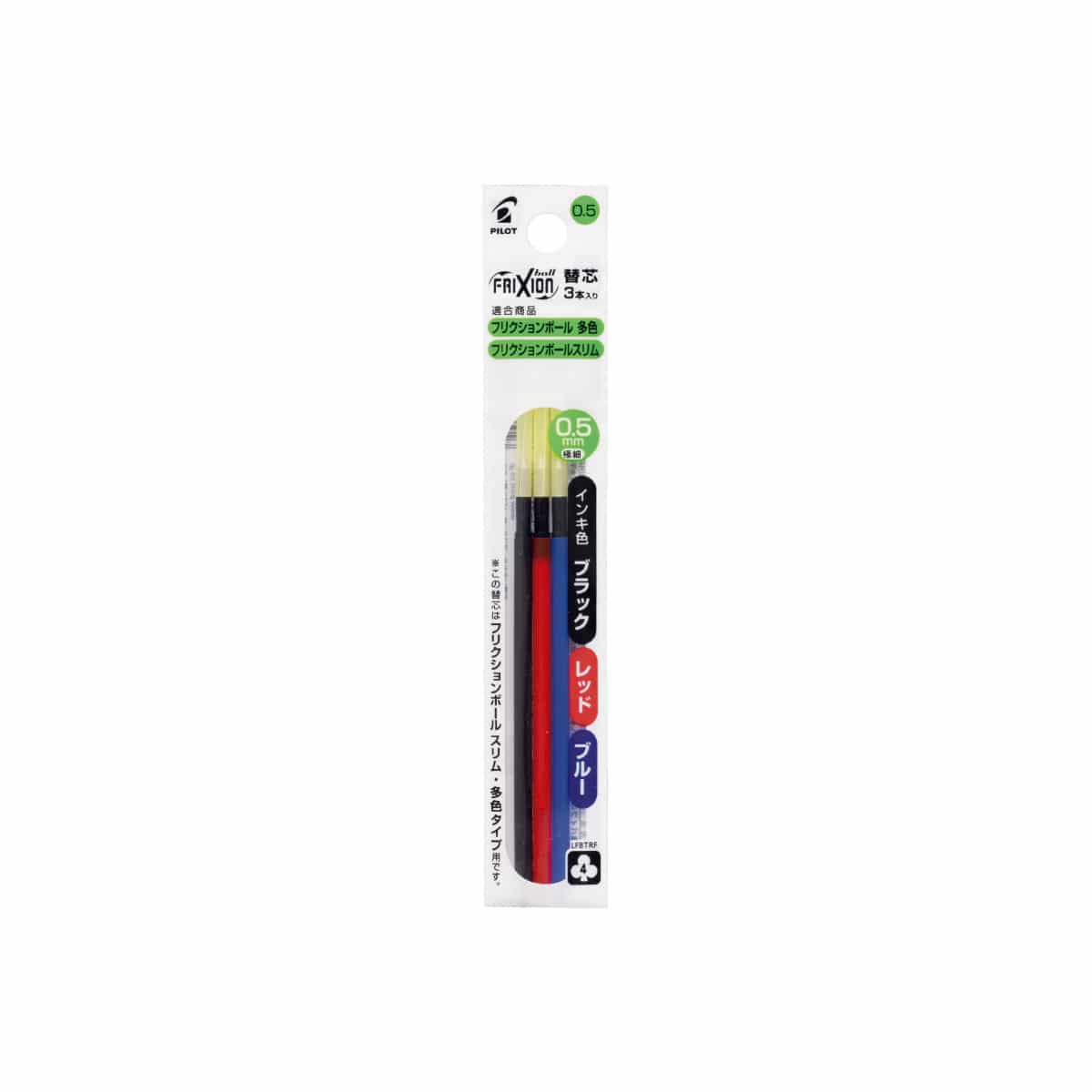 ●フリクションボール多色タイプ専用 0.5mm替芯 3本セット ●ペン先:極細 0.5mmボール ●レフィルサイズ:全長:87.5mm 最大径 3.6mm ●インキ色:ブラック、レッド、ブルー