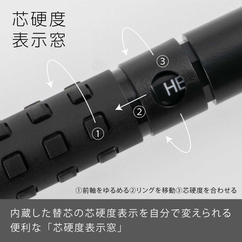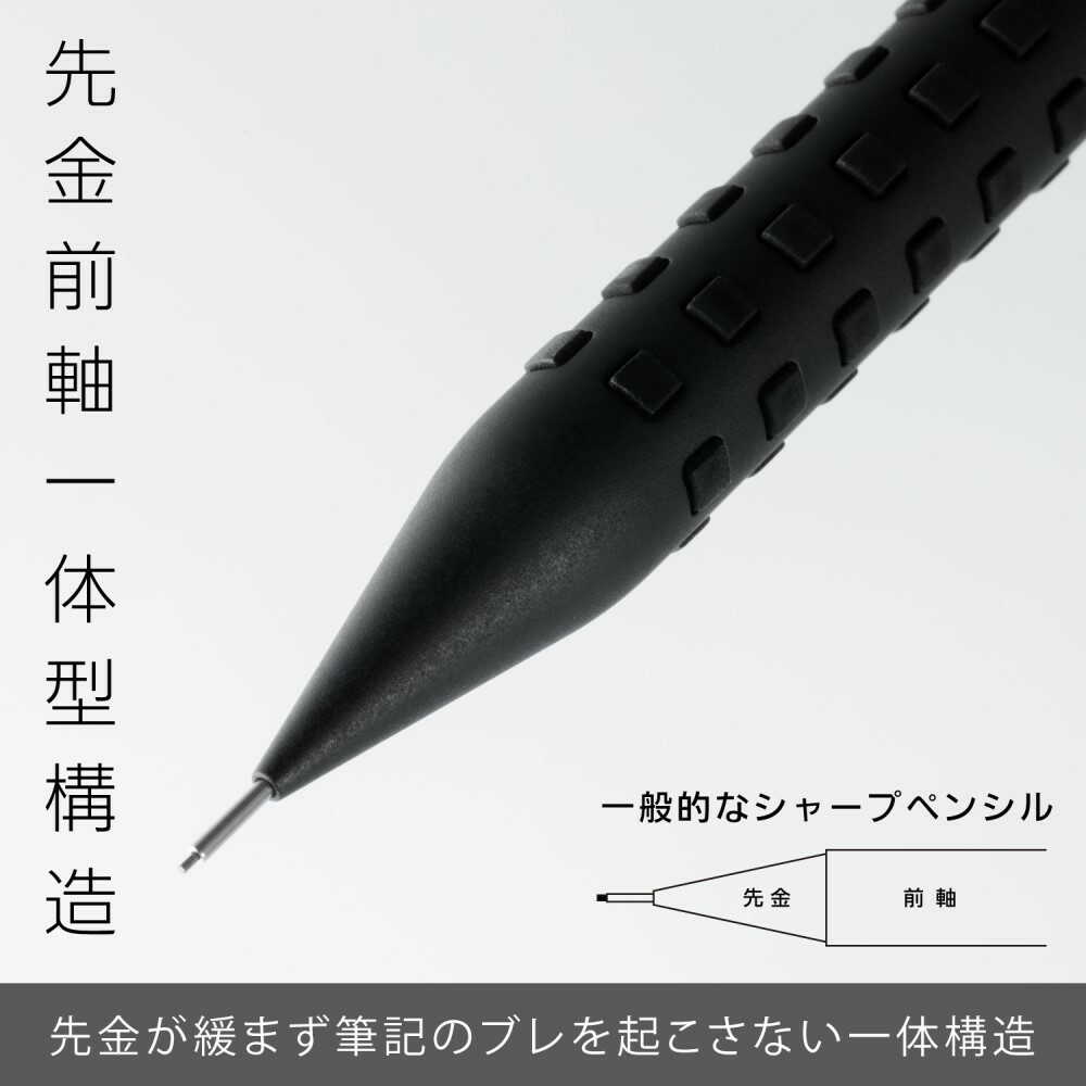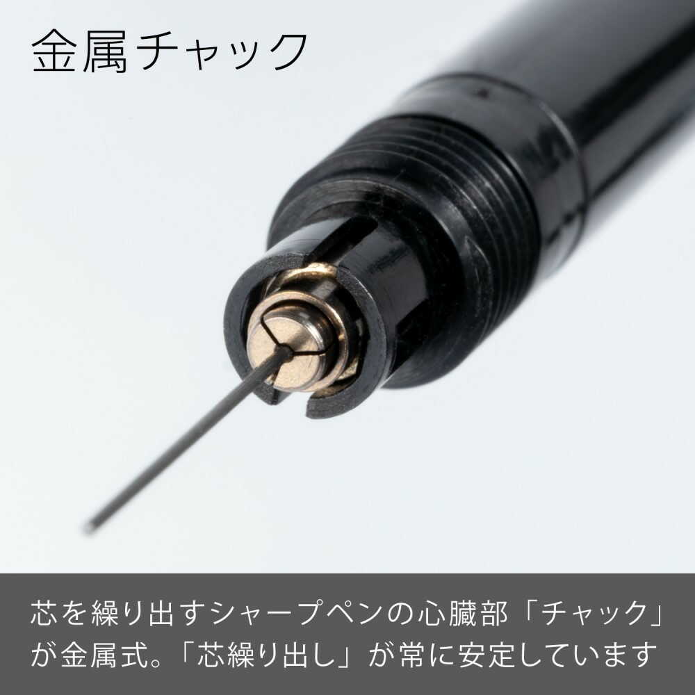 先金・前軸一体構造でブレない安定した書き心地。 手になじみ、しっかり握れる金属×ラバーグリップ。 芯硬度表示窓付き。 大型ラバーノック。 ●軸色:ブラック