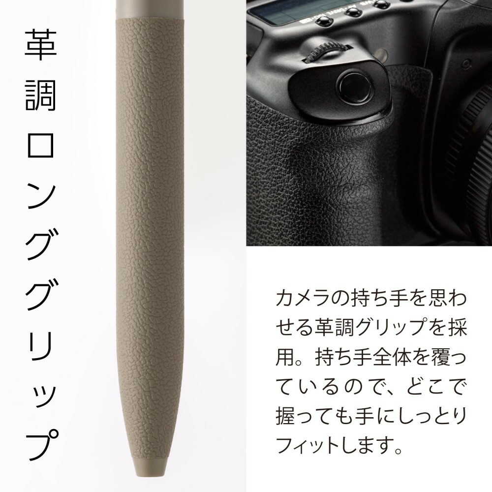 静かなノック感・革調のロンググリップ・マットな質感を備えた、なめらか油性ボールペンです。 日常的に使う油性ボールペンだからこそ、自分が心地よく使えるのはもちろん、周りの人や環境にもなじむように配慮した設計になっています。 ●インキ色:黒 ●軸色:カーキ
