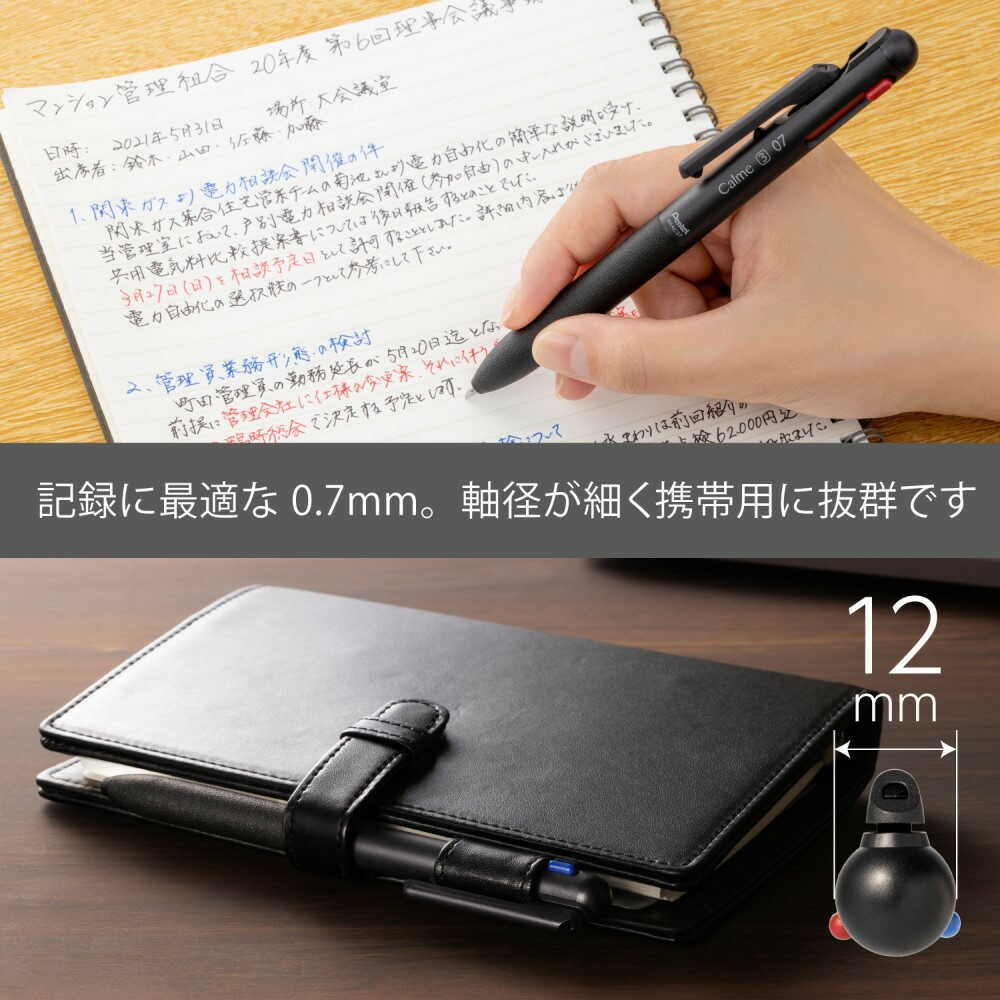 静かなノック感・革調のロンググリップ・マットな質感を備えた、なめらか油性ボールペンです。 日常的に使う油性ボールペンだからこそ、自分が心地よく使えるのはもちろん、周りの人や環境にもなじむように配慮した設計になっています。 ●インキ色:黒・赤・青 ●軸色:ブラック