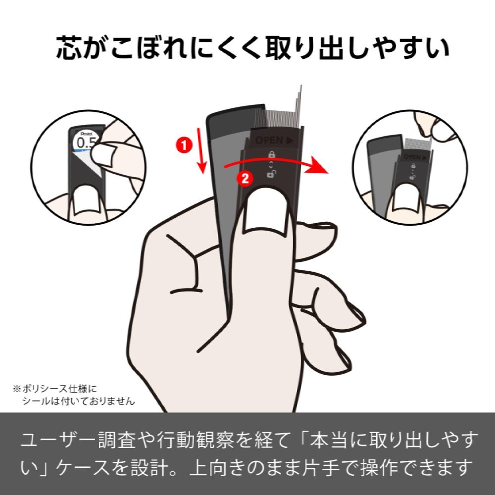 「なめらかさ」「折れにくさ」「汚れにくさ」など相反する関係にある項目を、高次元で両立。 原材料に特殊なオイルを使用する新製法により、なめらかな筆記感を実現しています。 調査や行動観察を繰り返して完成させた操作性の高いケース構造。 ケースを上向きのまま操作できるから、芯をこぼすリスクを減らせます。 芯の色(黒)を基調にしたカラーリング。 使用時は主張しないデザインでペンケースやデスク周りになじみます。
