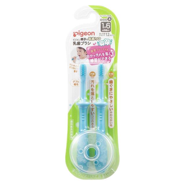 1才6ヵ月~ 歯と手の大きさに合わせて自分でしっかりみがく練習に。 2種類の硬さの違う植毛ブラシ。 内側は清掃効果の高いコシのある毛、外側は歯ぐきをキズ付けないやわらかい毛です。 ★ピジョン乳歯ブラシのポイント (1)歯ブラシに移行しやすい新しいヘッド (2)子どもが自分で持って上手にみがけるグリップ形状 (3)取り外し可能な安全プレート付き(かわいい絵柄付) →全8種類のうち、ランダムに1種類が入ります。 歯科医共同開発 【監修】日本歯科大学附属病院 臨床教授 倉治ななえ先生