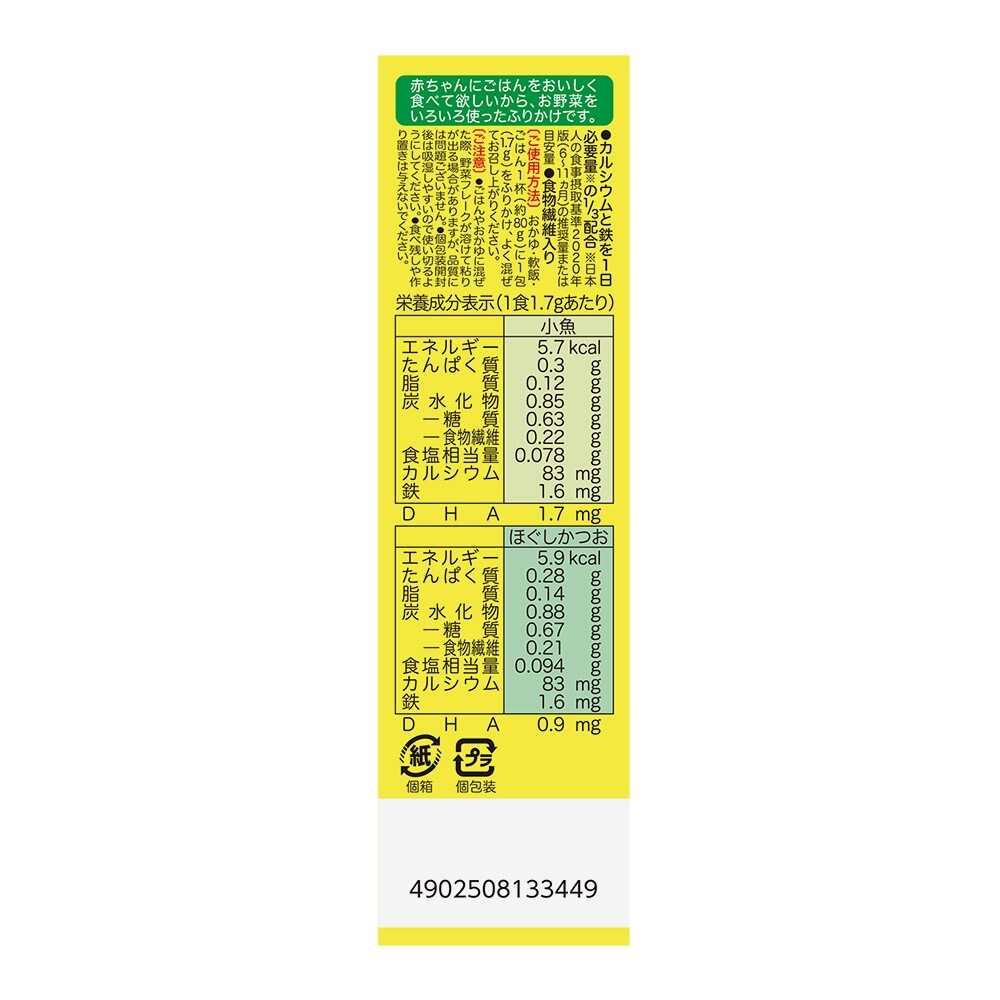 たくさんの種類の野菜を使った、選ぶ楽しさが広がるアソートふりかけです。 緑黄色野菜を5種類配合。 カルシウム・鉄分・食物繊維・DHA入り。 カルシウムと鉄分は、1日の必要量の1/3摂取可能。 着色料・保存料・香料は使用していません。