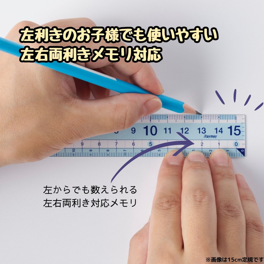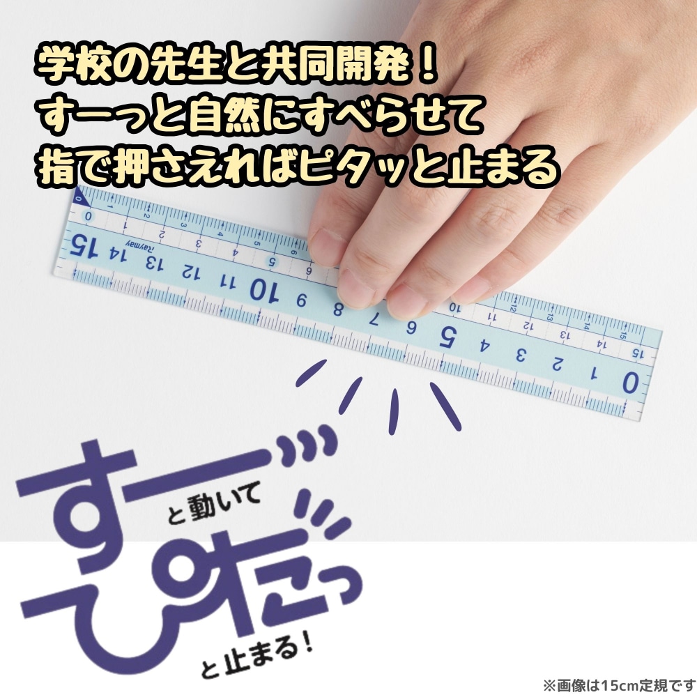 ●学校の先生と共同開発!現場の先生だからわかる、学習しやすい定規シリーズです。 ●握力の弱い子でもおさえやすい。すーっと自然に滑って、指で押さえればぴたっと止まる新感覚の「すべりどめ」付き。 ●対象物に合わせて測りやすい、はし0(ゼロ)メモリも採用。