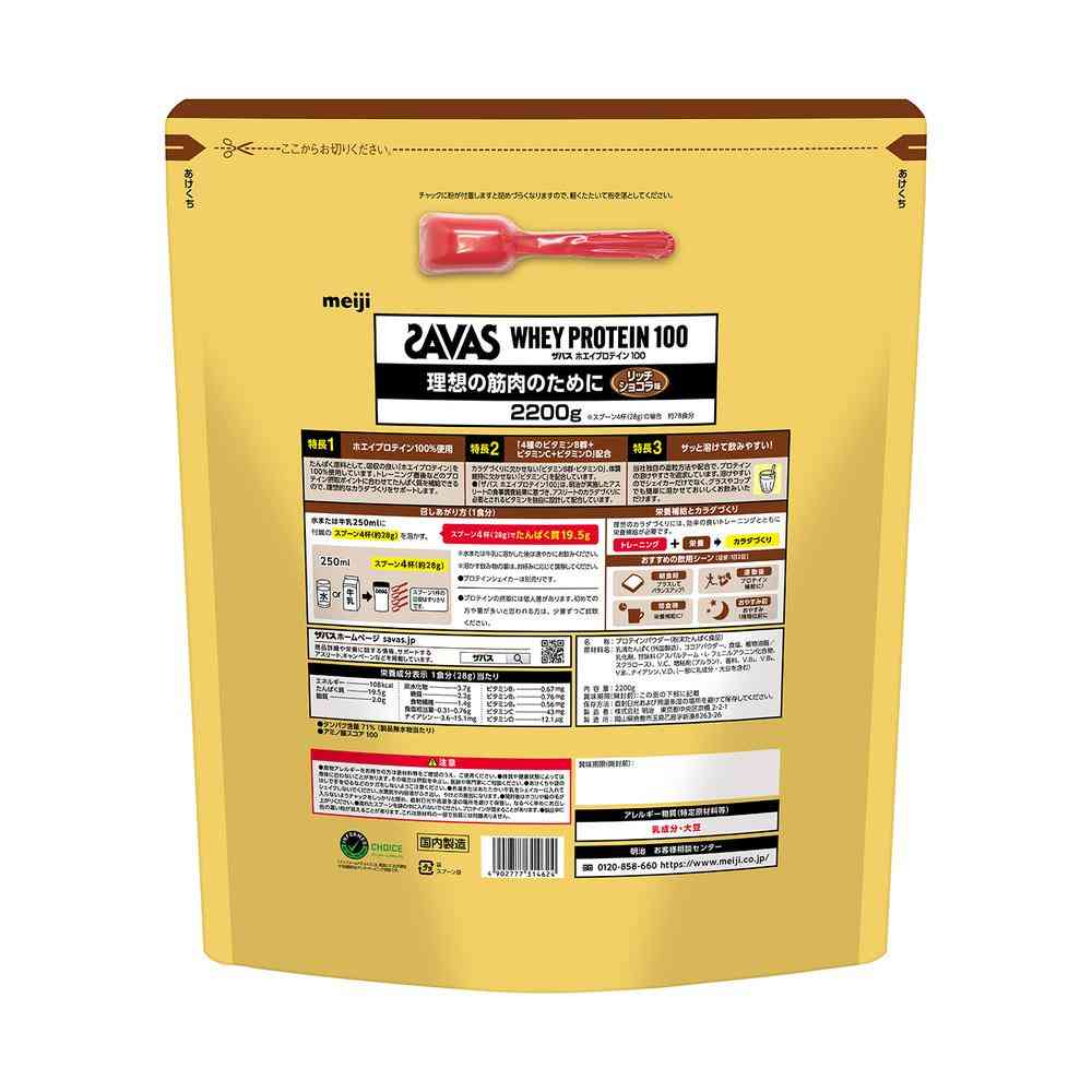 ●ホエイプロテイン100%使用 たんぱく原料として、吸収の良い「ホエイプロテイン」を100%使用しています。トレーニング直後などのプロテイン摂取ポイントに合わせてたんぱく質を補給できるので、理想的なカラダづくりをサポートします。 ●「4種のビタミンB群+ビタミンC+ビタミンD」配合 カラダづくりに欠かせない「ビタミンB群・ビタミンD」、体調維持に欠かせない「ビタミンC」を配合しています。 ●「ザバスホエイプロテイン100」は、明治が実施したアスリートの食事調査結果に基づき、アスリートのカラダづくりに必要とされるビタミンを独自に設計して配合しています。 ●サッと溶けて飲みやすい! メーカー独自の造粒方法や配合で、プロテインの溶けやすさを追求しています。溶けやすいのでシェイカーだけでなく、グラスやコップでも簡単に溶かせておいしくお飲みいただけます。 ●濃厚なリッチショコラ味 水でも濃厚なおいしさを実現しました。牛乳で溶かせば、濃厚な味わいのチョコレートシェイクのように召し上がれます。
