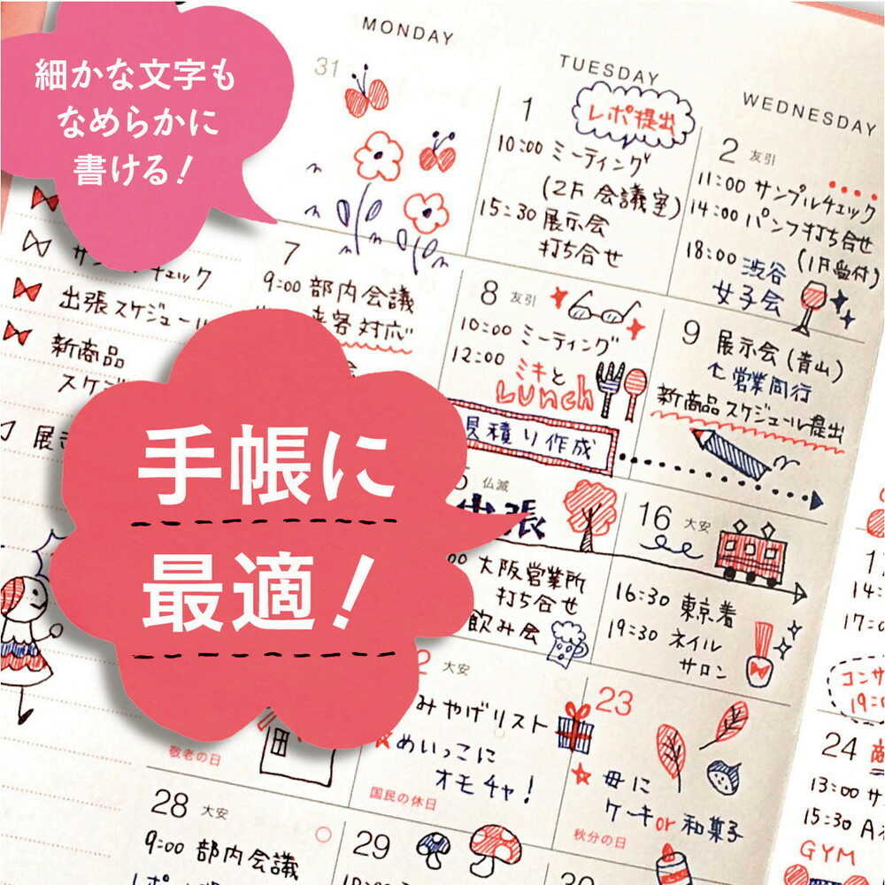 クセになる、なめらかな書き味。 超・低摩擦ジェットストリームインク搭載、極めてなめらかな書き味を実現しました。 従来の油性ボールペンと比較して、摩擦係数が最大50%軽減されています。 顔料と新しい色材を組み合わせることにより、くっきりと濃い描線を実現。 また、速乾性にも優れています。