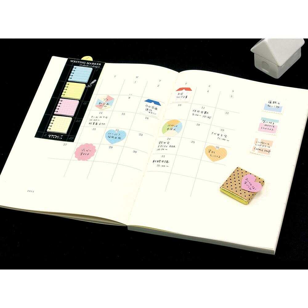 手帳のマス目に丁度いいサイズ。 貼ってはがせるメモなので、仮の予定などを書き込むのに便利です。 手帳の開きたいページに台紙を挟んでおくと、しおりにもなり、必要な時すぐに付せんを使えます。