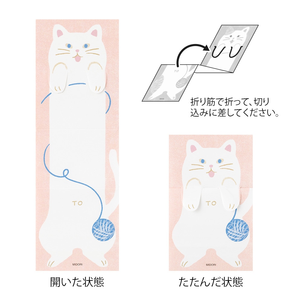 メッセージを書いて折りたたむとメッセージが隠れ、開くと動物の体が伸びてメッセージを読める、楽しいデザインの一言メモです。「ミドリ」で人気の動物をモチーフに採用し、たたんだときは通常のフォルム、広げると動物たちが長~く伸びて、メッセージを読むことができます。メモを受け取る人も渡す人も、くすっと笑顔になる、コミュニケーションのきっかけになるようなアイテムです。同じモチーフで異なる2つのデザインのメモが入っています。 ネコを抱えたときに、体が伸びる様子を表しています。絡まっている毛糸がポイントです。