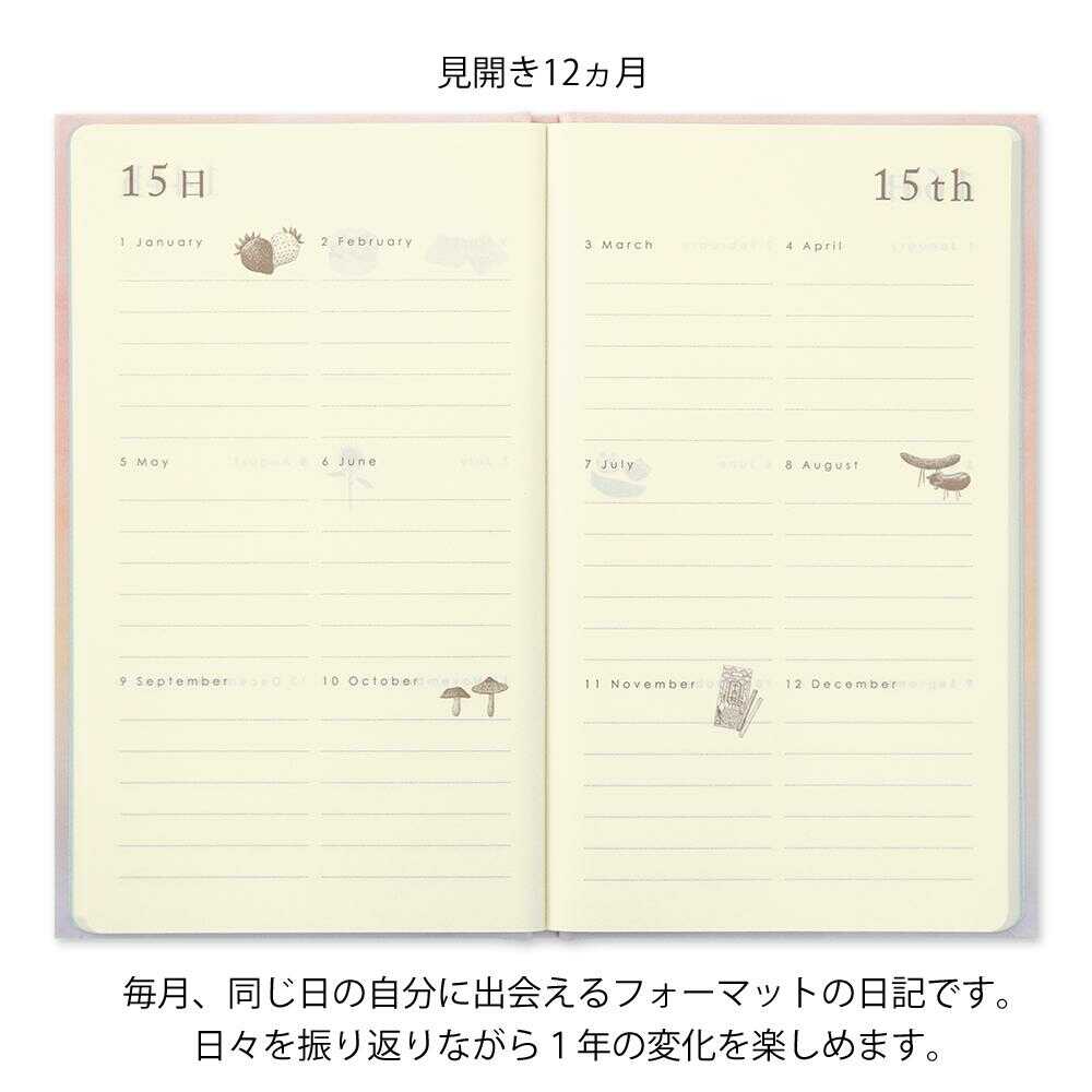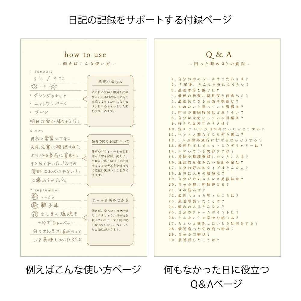 見開き2ページの中で、同じ日付を12ヶ月分書き込む日記です。 季節が感じられるイラストも入り、日々を振り返りながら1年の変化が楽しめるフォーマットになっています。 書くことが思い浮かばない時に役立つ「Q&A」や豊富な書き見本など、書き方をサポートする付録ページも充実しています。