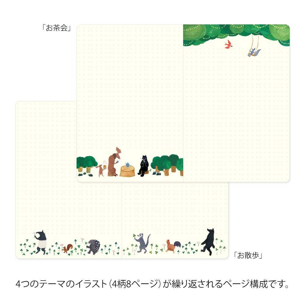 「ゆるログ」は、誰でもかんたんに、ゆるく楽しく日々の記録が続けやすいノートシリーズです。 ドット方眼が線を引くときや文字を書くときのさりげないガイドになったり、シールや写真もきれいに貼りやすくなっています。 森の動物柄は「お散歩」「音楽会」「お茶会」「パン屋さん」という4つのテーマで、見開きごとに異なるデザインが楽しめます。 同シリーズのカバーやシールと組み合わせることで、書くことも見返すこともさらに楽しくなる、そんな日々の記録を彩るノートです。 5mmドット方眼、80ページ