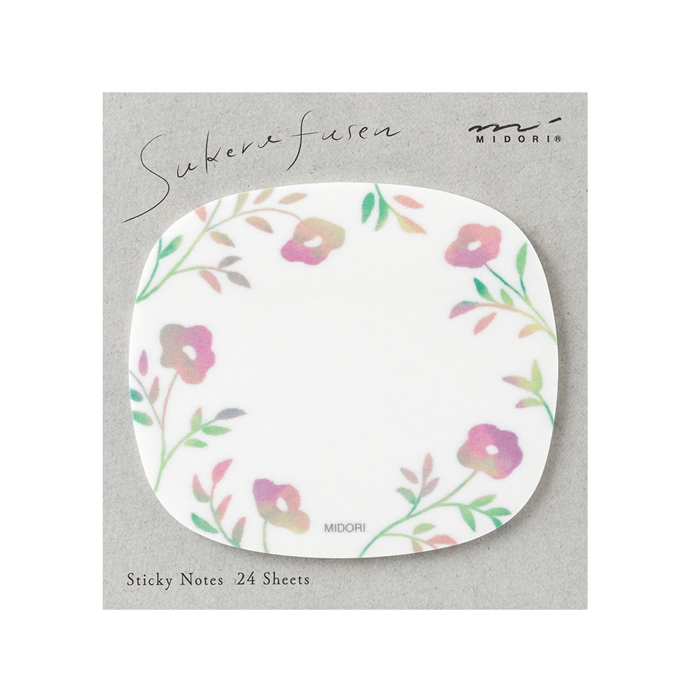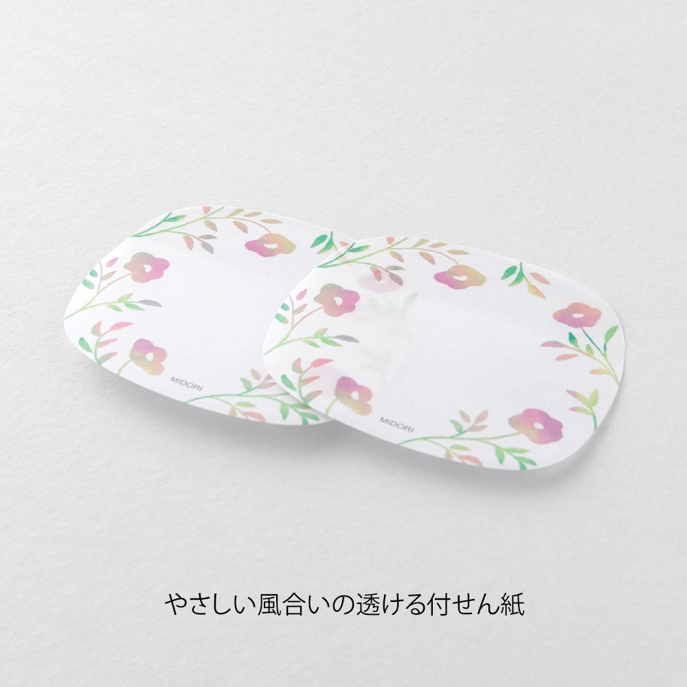 ほんのり透ける紙素材の風合いを生かし、窓から見える風景を切り取ったようなデザインの付せんです。角のない丸いフォルムは使いやすく、優しい印象を与えます。手土産やちょっとした贈り物に添えたり、親しい人にメッセージを送ったりと幅広いシーンで使用できます。メッセージをやさしく包み込む花をイメージしました。花や葉の色がグラデーションになっているのがポイントです。