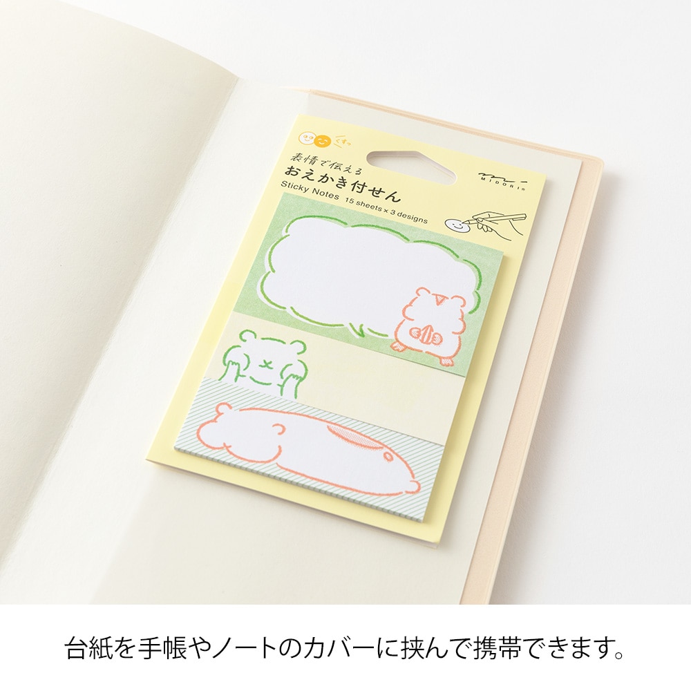 気持ちやシーンに合わせて、動物の顔を自由に描いて楽しめる付せんです。 ベースとなる動物の絵柄の中に、笑顔や泣き顔など、お好きな表情を描き込み、メッセージを添えれば、簡単に自分らしいアレンジが完成します。お絵描き感覚で楽しみながらお使いいただけます。暮らしの中でのちょっとしたコミュニケーションにぴったりです。 口いっぱいにほおばっているポーズや、脱力ポーズがかわいいデザインです。