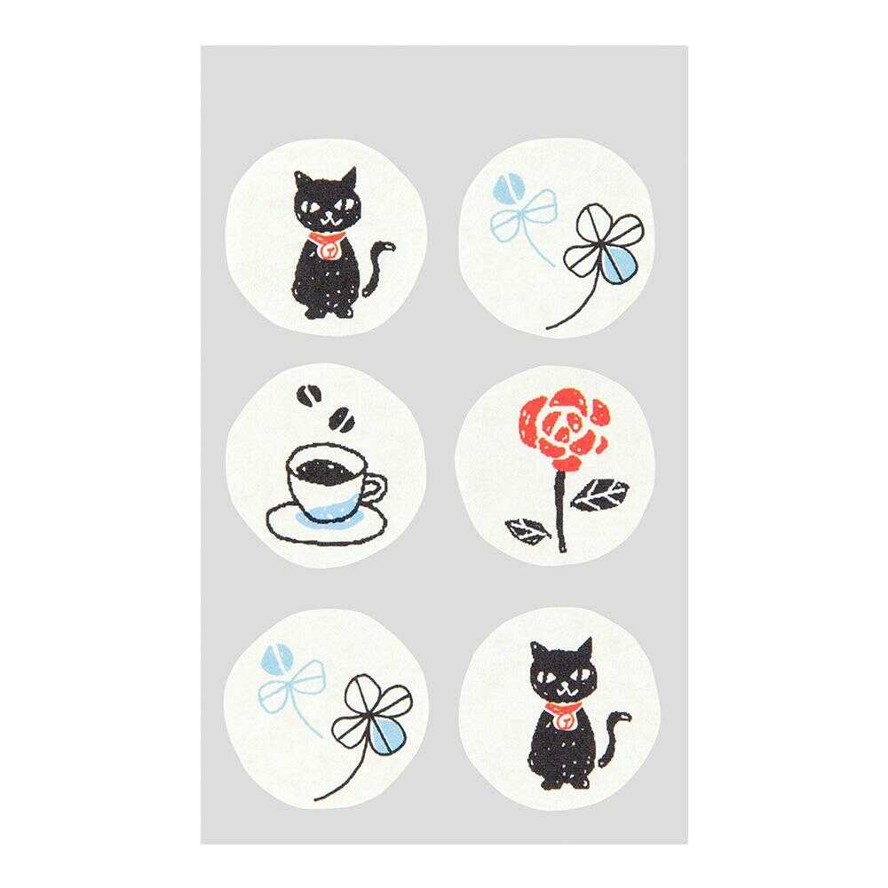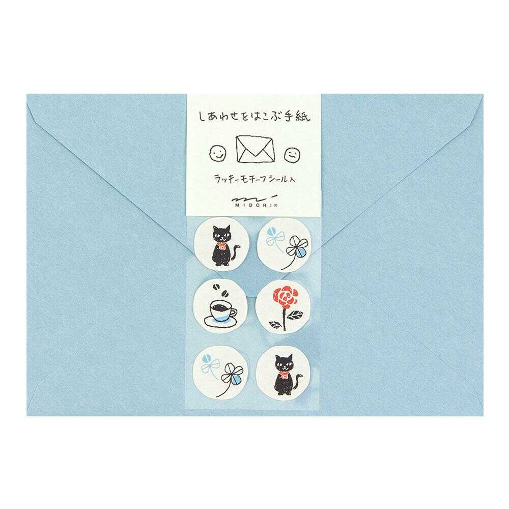 クローバー、くろねこ、コーヒー、バラ。4種の封かんシールが付付き。 2色の封筒がセットになっています。