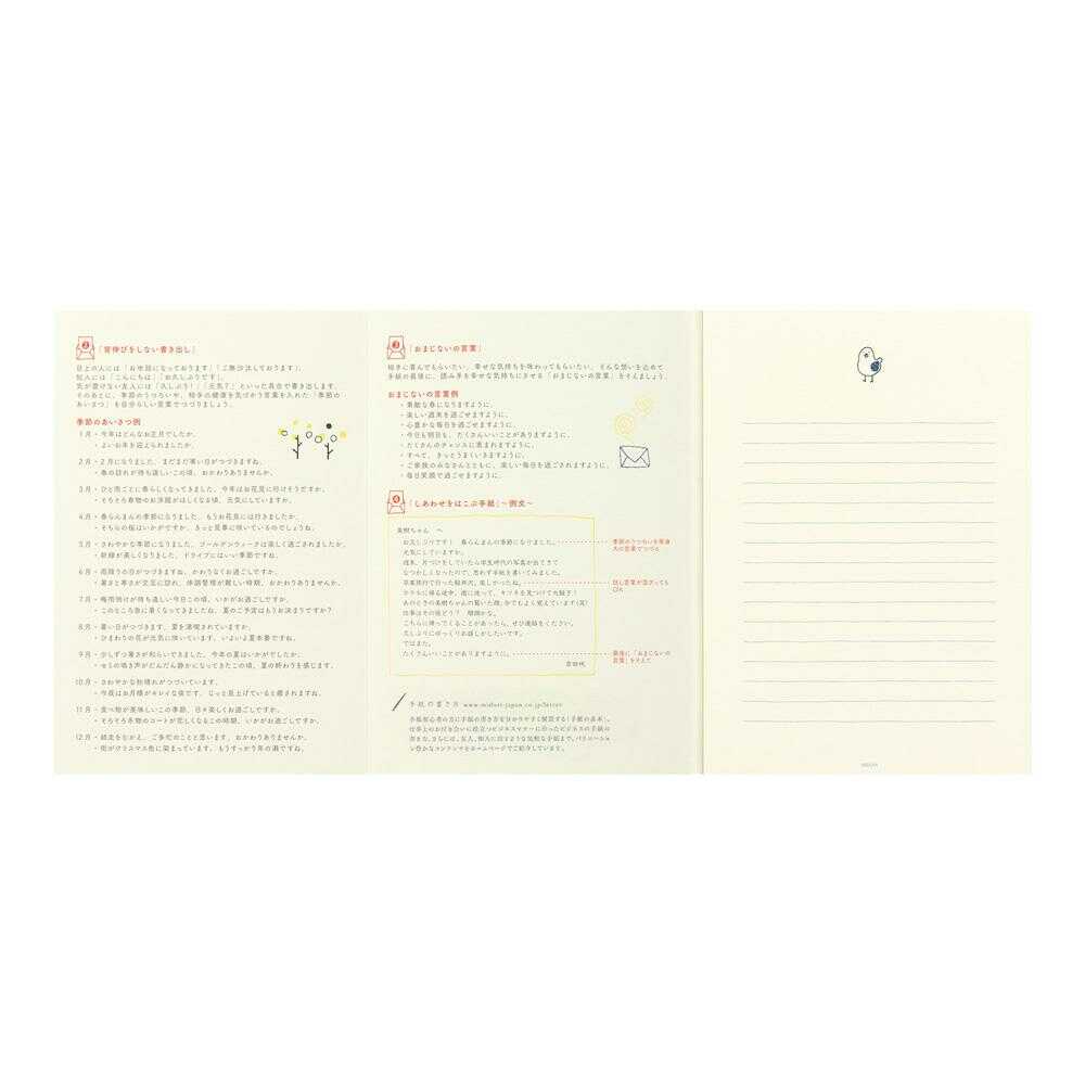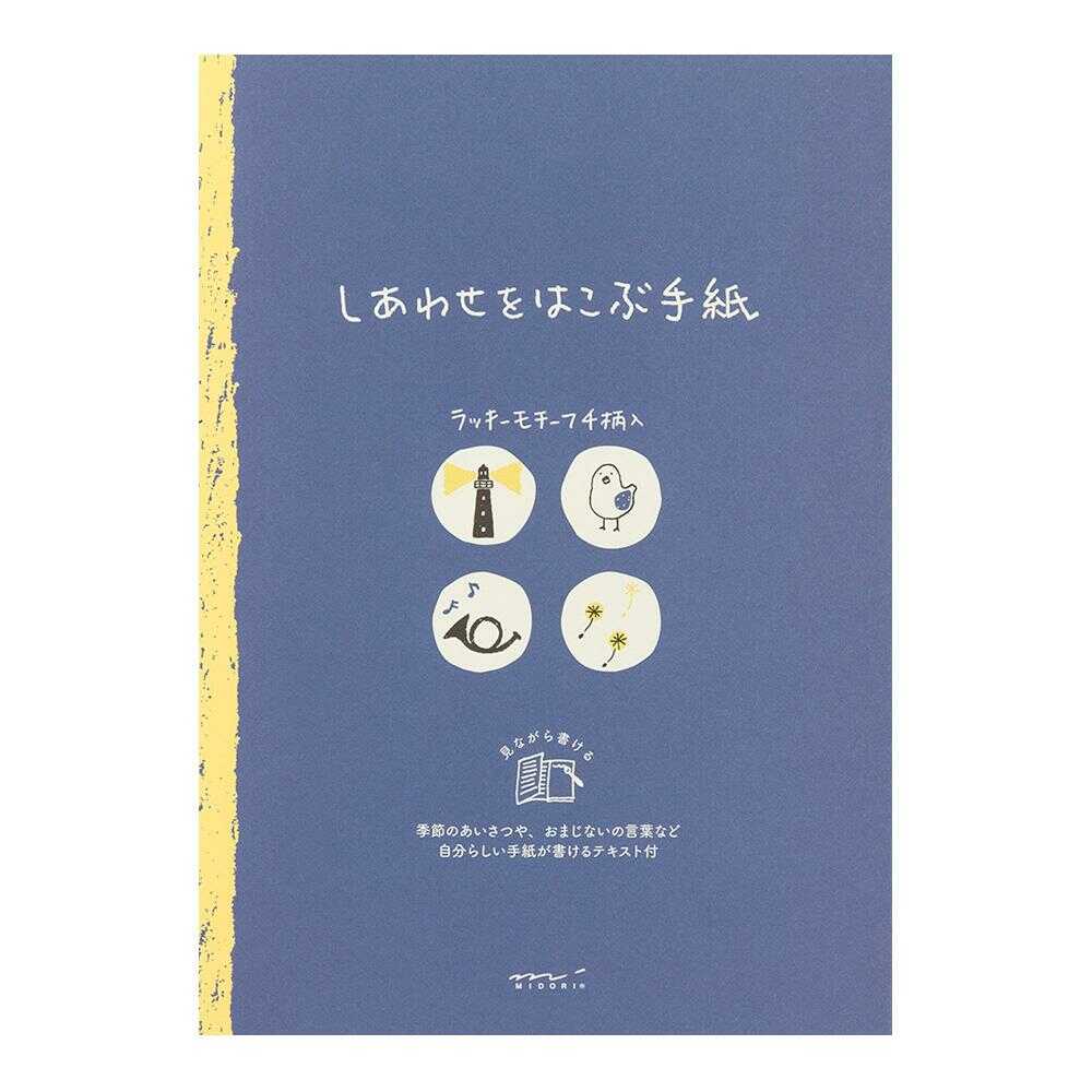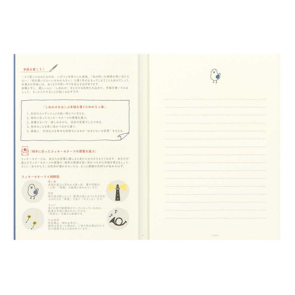 青い鳥、灯台、ラッパ、たんぽぽの4つのラッキーモチーフをあしらった、本のように開いて書ける便箋です。 表紙を開いた左ページには、季節のあいさつやおまじないの言葉など、手紙を書く時に参考になるテキストがついています。