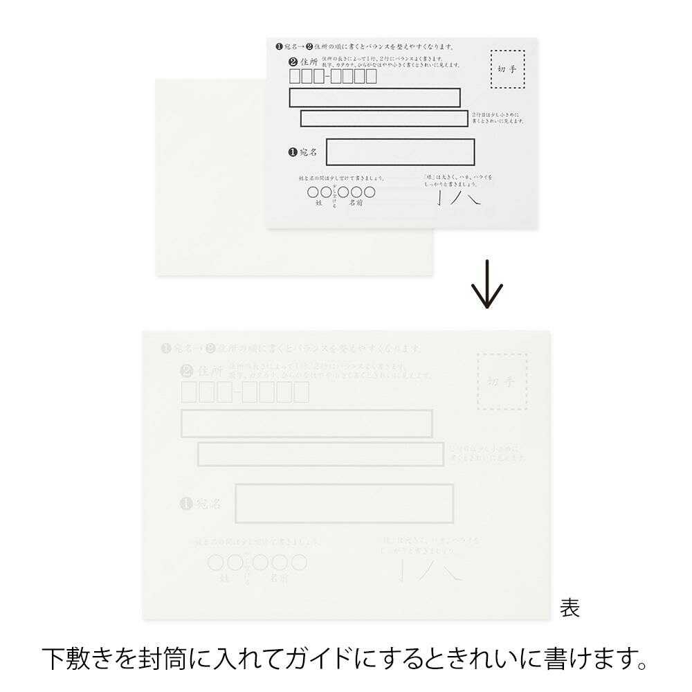 付属の「秘密の下敷」を使うことで、バランスよく住所、宛名を書くことができる封筒です。 手紙が透けるのを防ぐために使用する紙が付属しています。