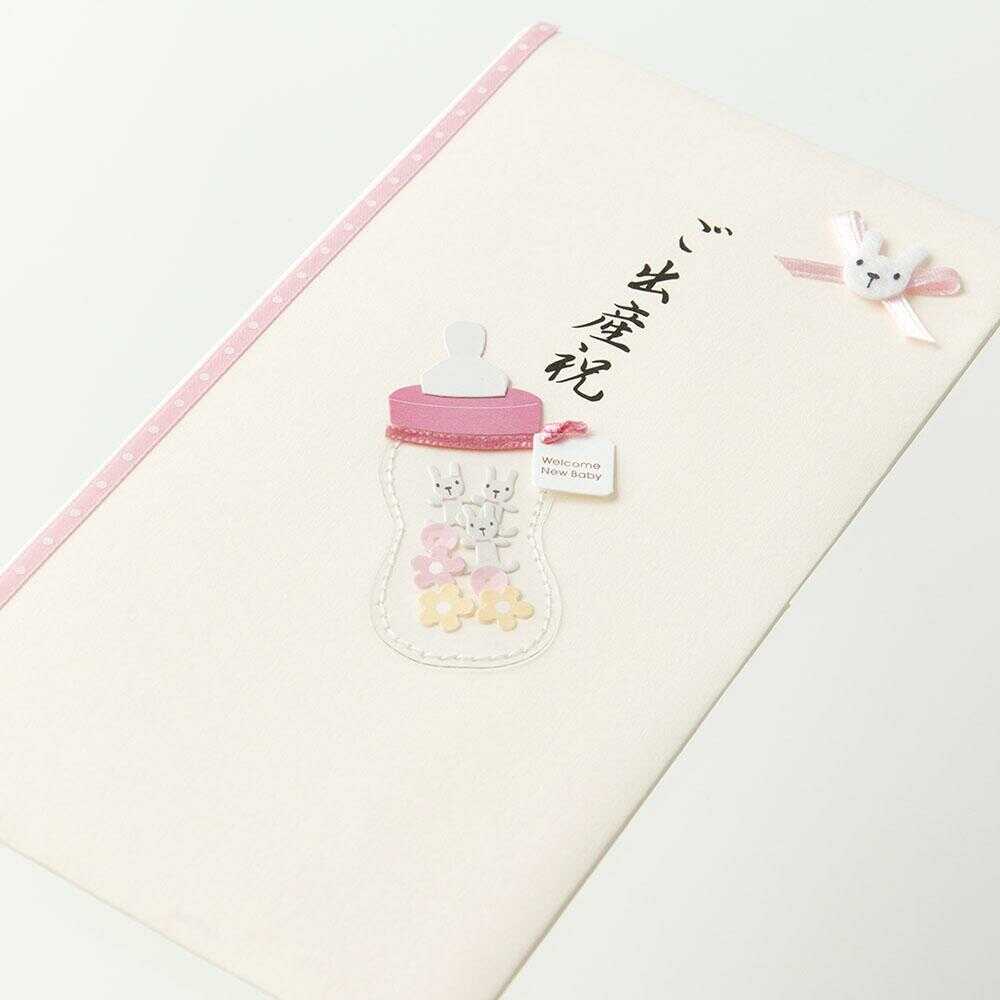 立体的なハンドメイドのクラフトシールが付いた金封です。 哺乳瓶の中に小さなウサギやお花が入った、かわいらしいデザインです。