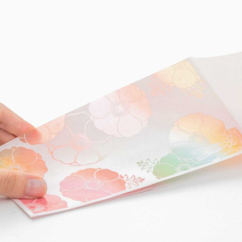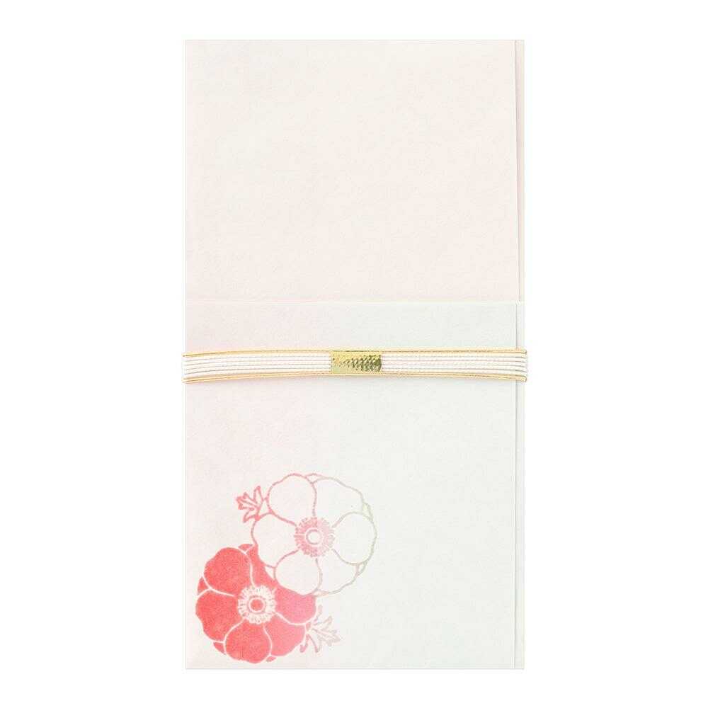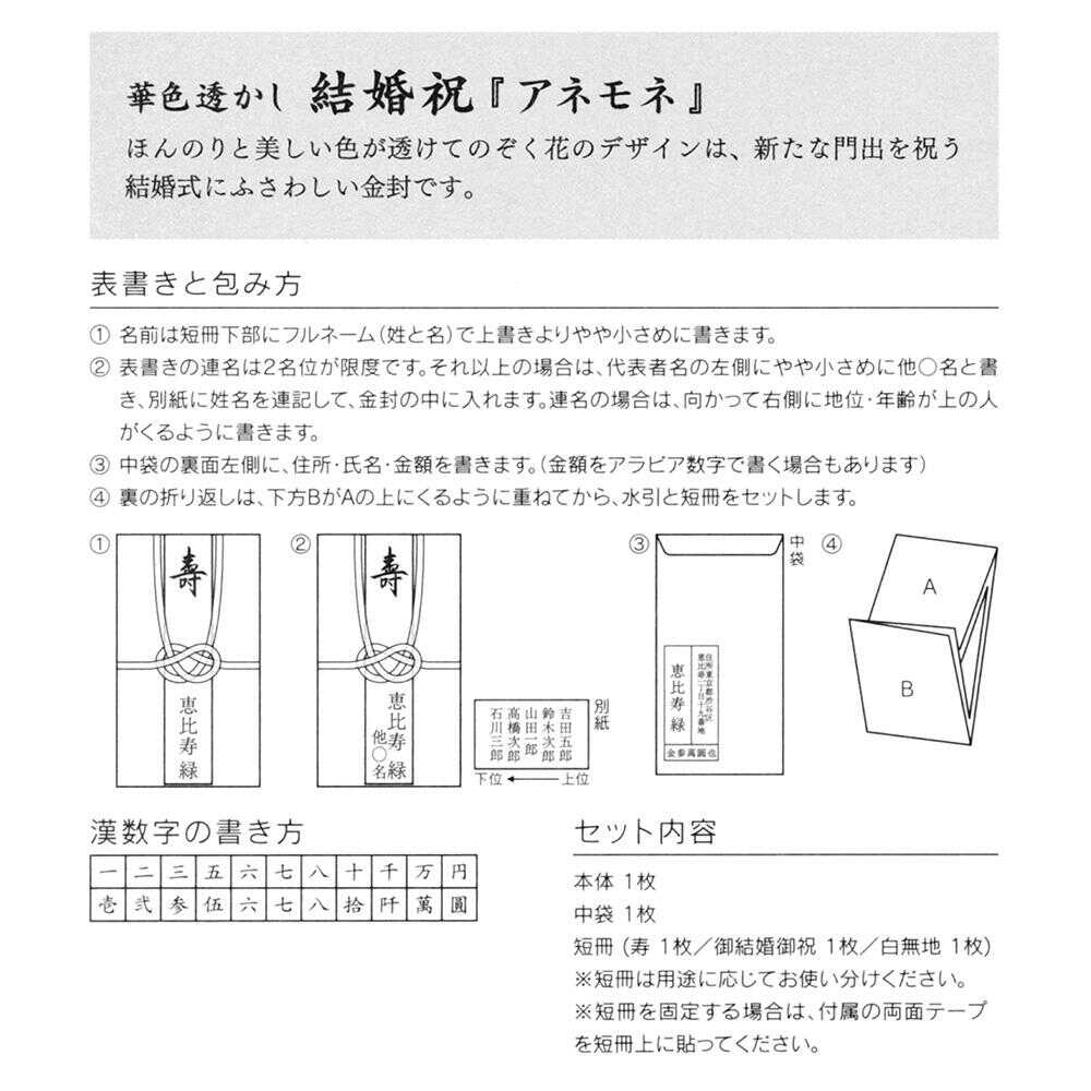 美しい色が透けてのぞく花のデザインが、新たな門出を祝う結婚式にふさわしい金封です。 可憐なアネモネは、清純や無垢という花言葉をもっています。 短冊(寿、御結婚御祝、無地各1枚) 表書きと包み方解説付 金額目安:2~5万円