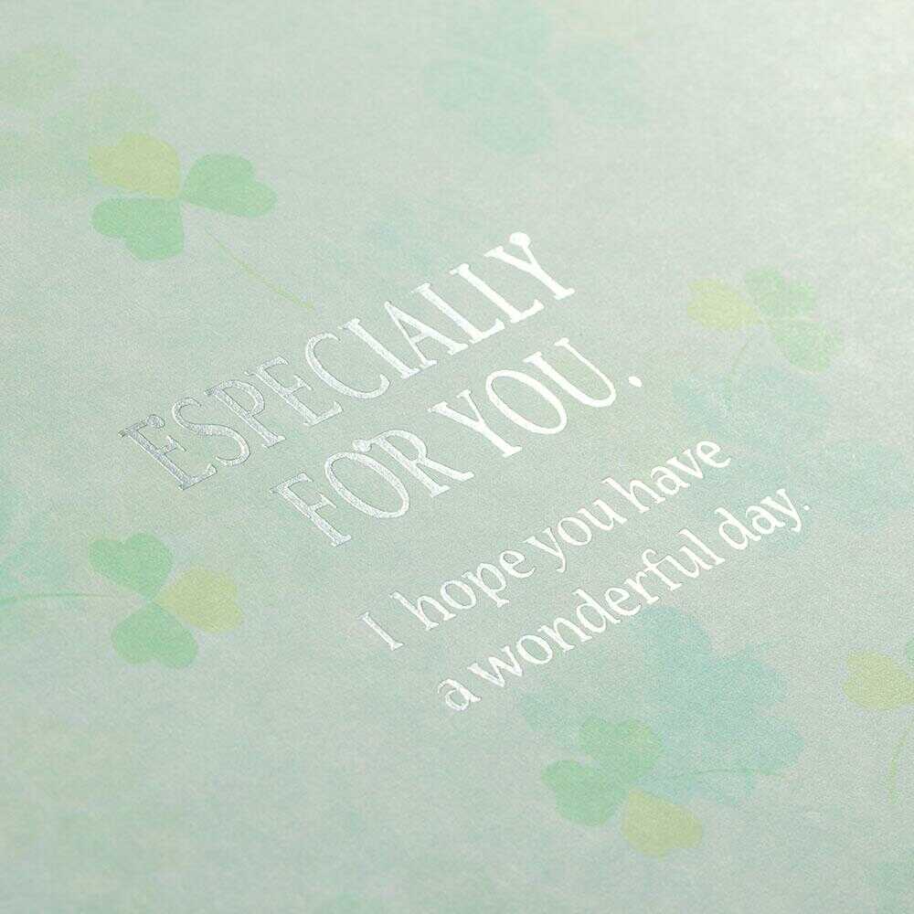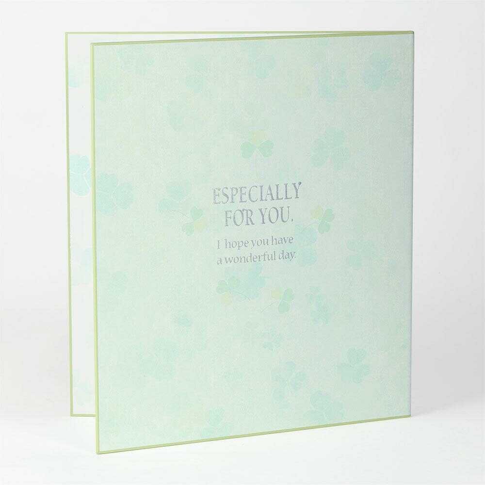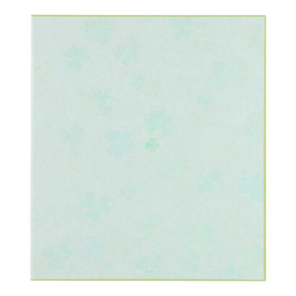 贈る相手やシーンを選ばず使える、ナチュラルなクローバーのデザイン。 表紙には銀箔押しが入っており、ほどよい上品さのある色紙です。 開くと一般的な色紙の2倍のスペースで、たっぷり寄せ書きを書いたり、写真やシールを貼ったりと自由にお使いいただけます。