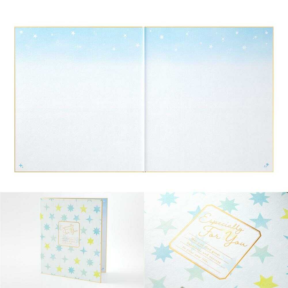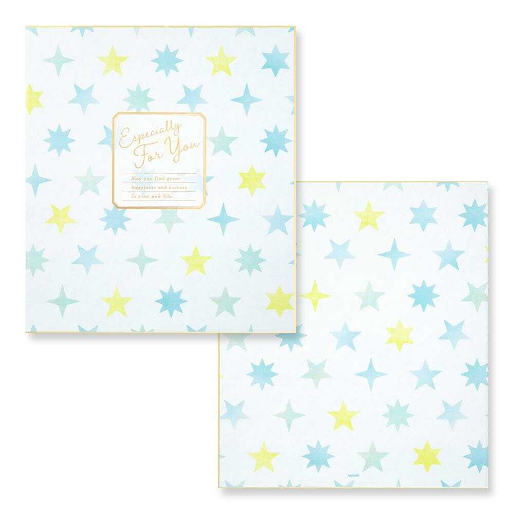 簡単に寄せ書きができる、シール付き色紙。 大人数に対応した、メッセージシール36枚入りの二つ折り色紙です。 シールを彩る金箔と美しいカラー、シンプルながら華やかなデザインで、シーンを選ばずにお使いいただけます。 星柄は新しい一歩を踏み出す友人の成功を祈り、応援する時にぴったりです。 記入用シール36枚、タイトルシール1枚、飾りシール19枚