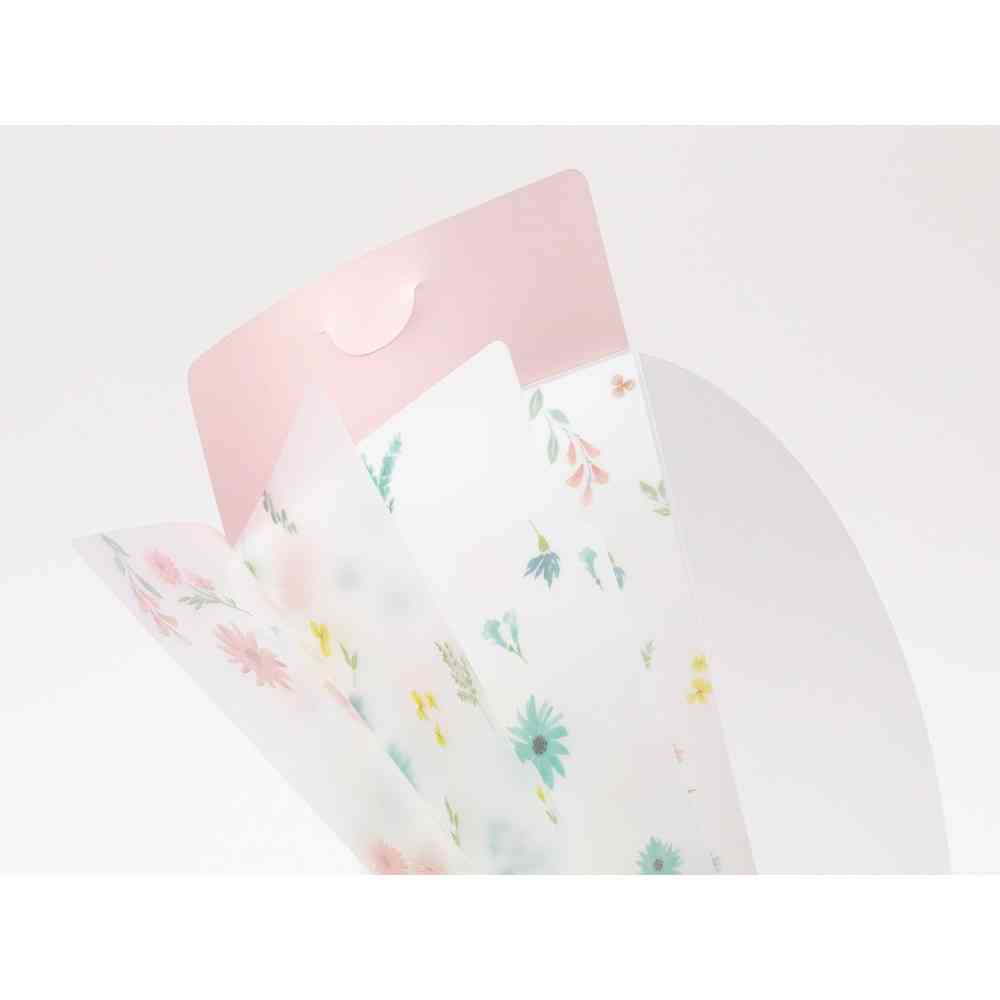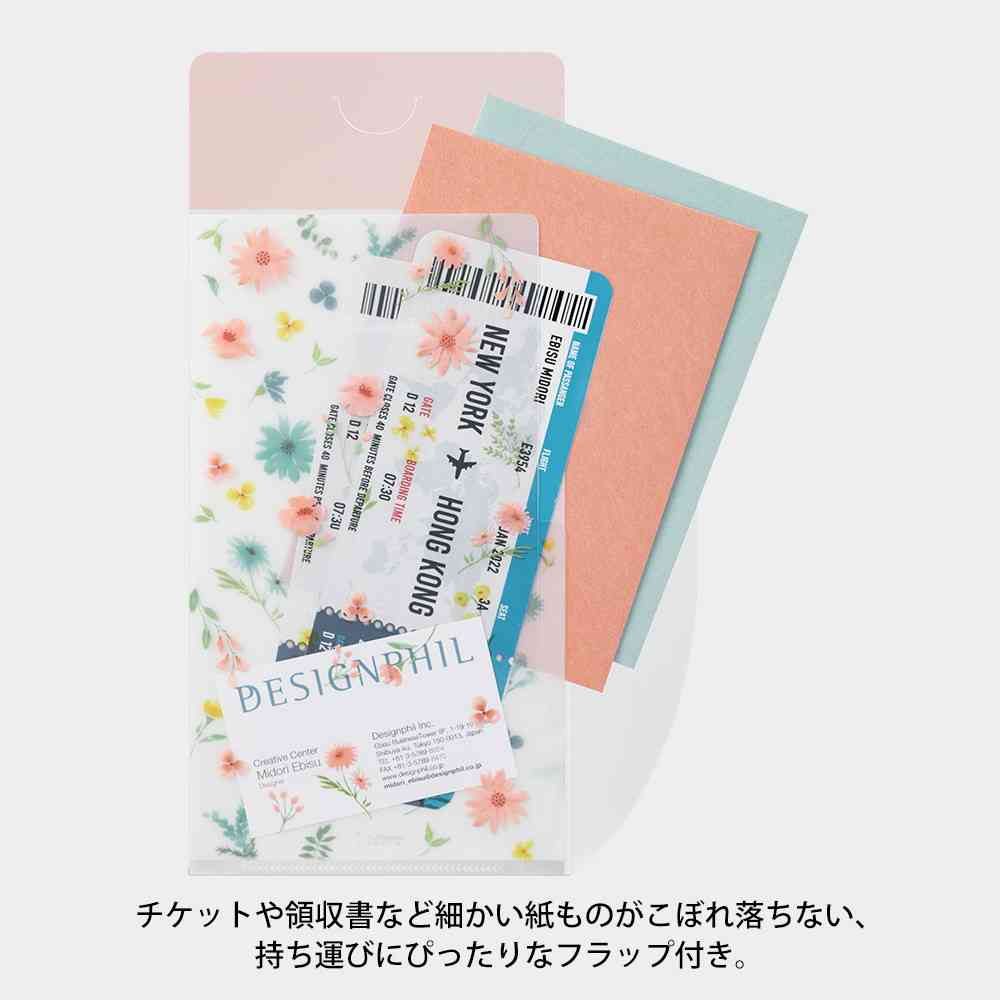用途ごとに書類をざっくり仕分けられる3ポケット仕様のクリアホルダーです。 チケット、A4 三つ折り、マスク、小物が入るA5スリムサイズ。 フタ付きなので、鞄の中で中身がバラバラとこぼれません。 重ねることで淡い水彩タッチの花々が重なり合う、華やかなデザインです。