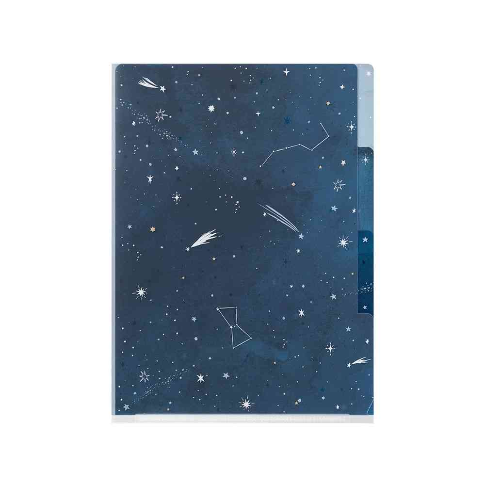 用途ごとに書類をざっくり仕分けられる3ポケット仕様のクリアホルダーです。 大きめのチケットやパンフレット類の収納にも便利。 持ち歩きやすいA5サイズです。 夜空に浮かぶ星が描かれた、落ち着いた使いやすいデザインです。