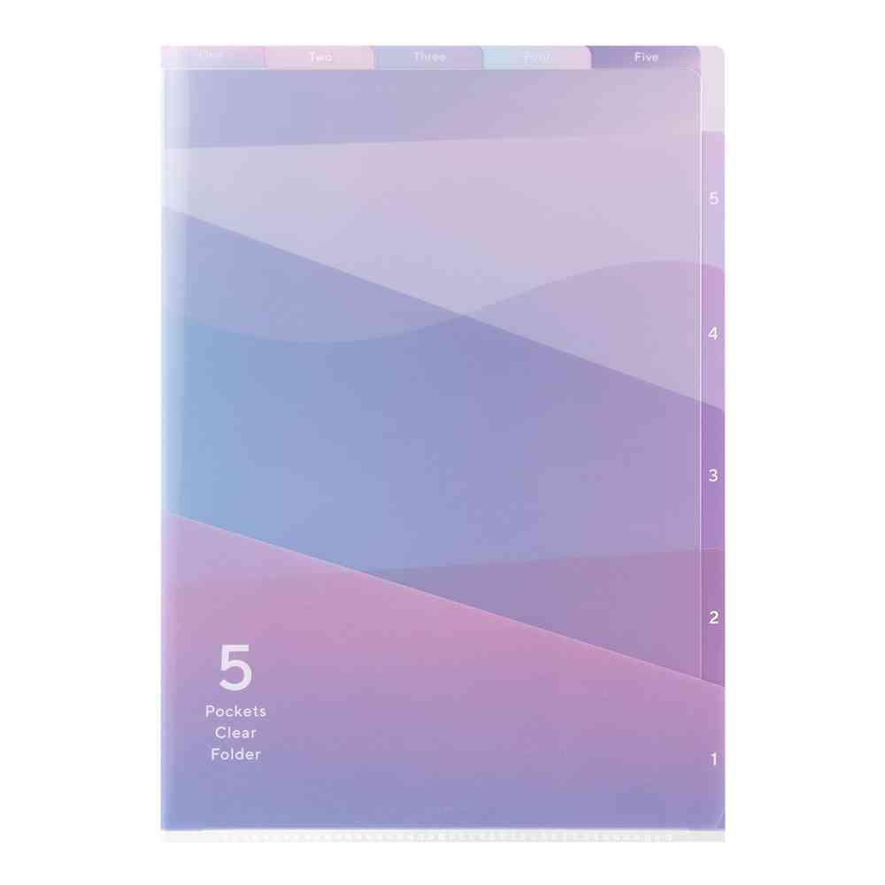 右端が大きく開き、書類の出し入れがスムーズな、5ポケット仕様のクリアホルダーです。 ポケットにはインデックスがついているので用途ごとに整理したり、書類を探すのにも便利です。 A4は書類の分類に最適で、仕事に、家庭に、勉強に、汎用性が高い定番サイズです。 ビジネスシーンでも使いやすい、スタイリッシュでシンプルなデザインです。