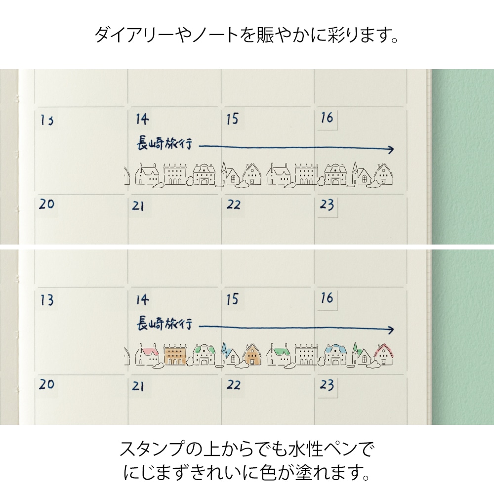ノートやダイアリーの記録を楽しむためのローラータイプのスタンプです。インキが入っている浸透印なのでスタンプ台は不要。これ1つで連続して繋がる、3つの繊細な柄をきれいに押す(スタンプする)ことができます。ページにできた余白や上下のスペースを賑やかに彩ります。 3つのスタンプはスタッキングするように連結できる構造です。インキは油性顔料なので、押した絵柄の上から水性マーカーで色を塗ってもにじみません。各柄約40m押すことができます。 愛嬌がある見た目と、形に特徴があるイヌ柄です。花壇柄は連続して押してもかわいい柄に仕上がっています。とても細かなデザインも魅力です。