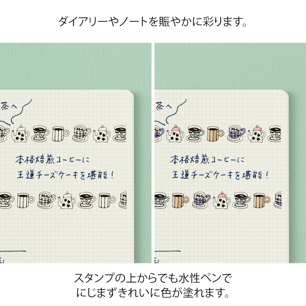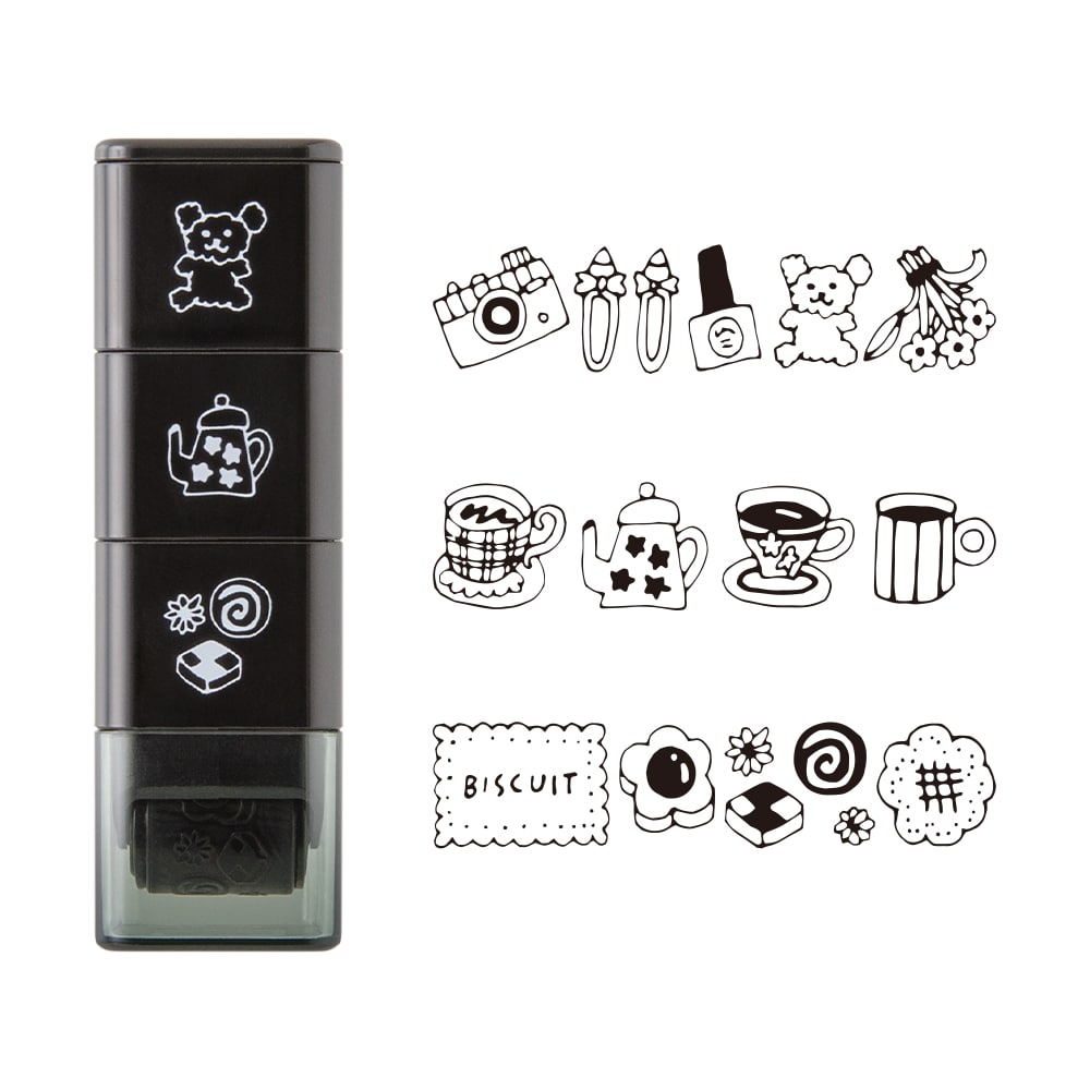 ノートやダイアリーの記録を楽しむためのローラータイプのスタンプです。インキが入っている浸透印なのでスタンプ台は不要。これ1つで連続して繋がる、3つの繊細な柄をきれいに押す(スタンプする)ことができます。ページにできた余白や上下のスペースを賑やかに彩ります。 3つのスタンプはスタッキングするように連結できる構造です。インキは油性顔料なので、押した絵柄の上から水性マーカーで色を塗ってもにじみません。各柄約40m押すことができます。 小物柄は、丁寧な暮らしを意識している人が好みそうなモチーフを集めました。カップ柄はちょっとひと息感を表し、ゆっくりした時間や、のんびりした時の記録におすすめです。クッキー柄はそれぞれのクッキーの形がかわいく、どこか幾何学的なシルエットに見えるので連続するローラーの柄です。フレームのように使用したりしやすい柄です。
