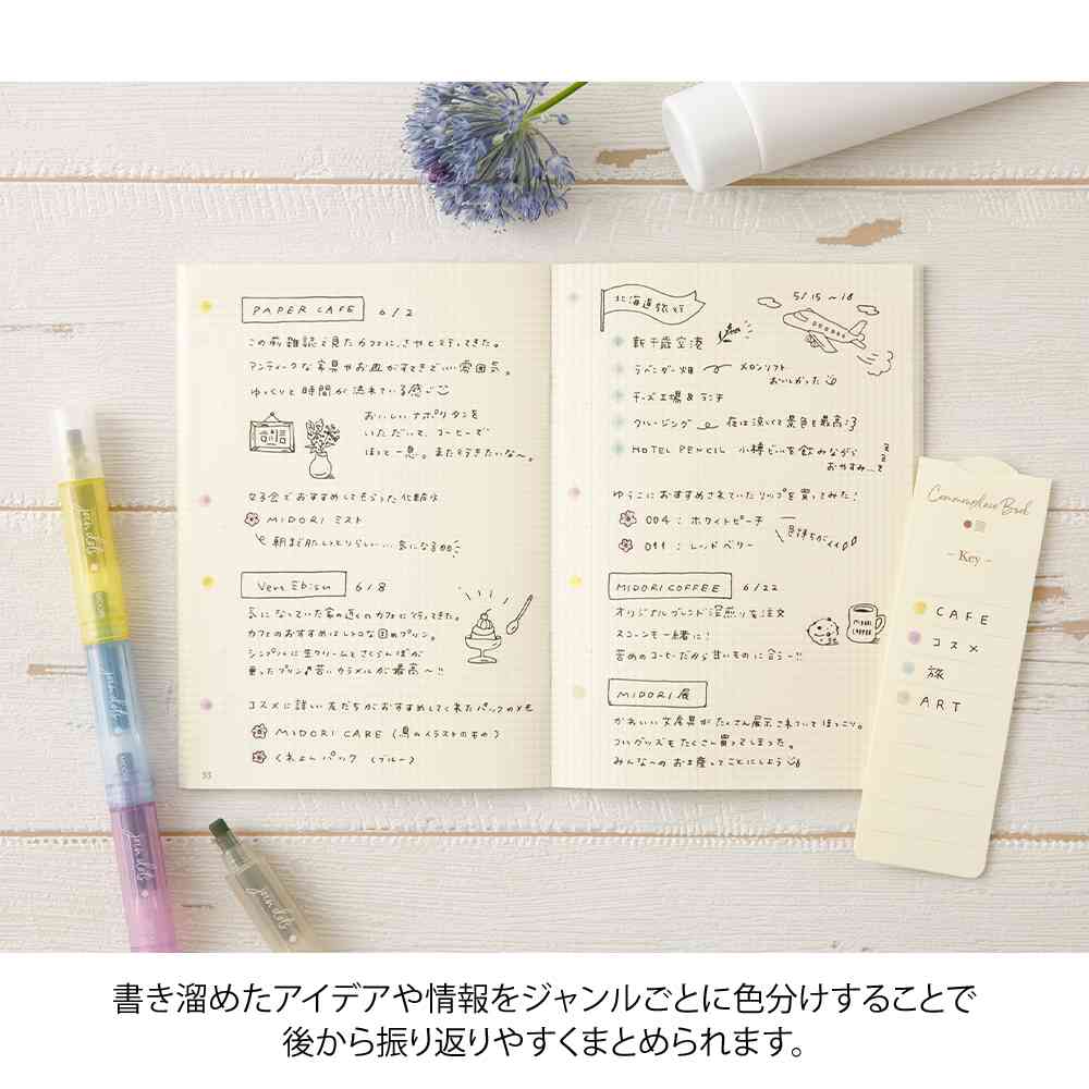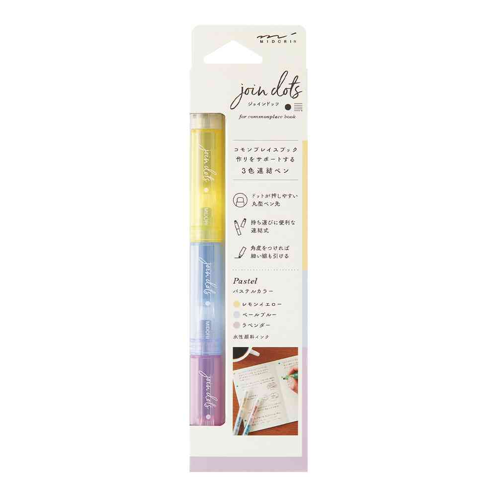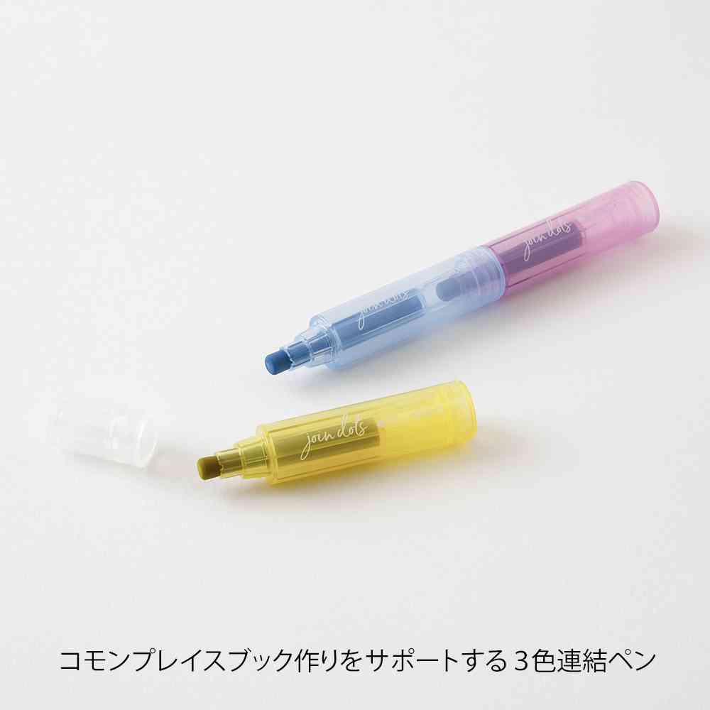 ドットがきれいに押しやすい丸形ペン先の、3色一体型の連結ペンです。 コモンプレイスブックをサポートするために開発されました。 コモンプレイスブックとは、書き溜めたアイデアや情報をジャンルごとに色分けすることで後から振り返りやすいように一冊にまとめたノートです。 この情報分類に不可欠な複数カラーのマーキングを、連結ペン1本で3色分がカバーできるという機能的な筆記具です。 複数色をスリムに持ち運べ、押すだけでドットが描ける丸型ペン先はコモンプレイスブック作りの強い味方。 いつもノートと一緒に持ち歩き、充実した手書きライフを楽しみましょう。