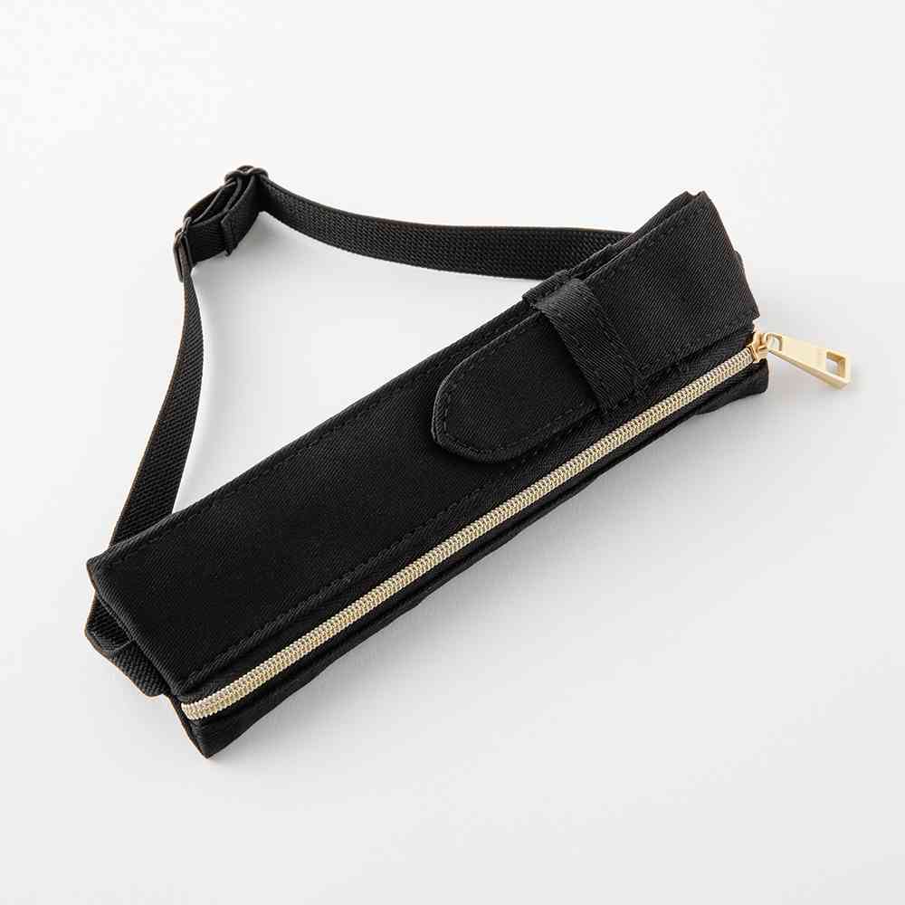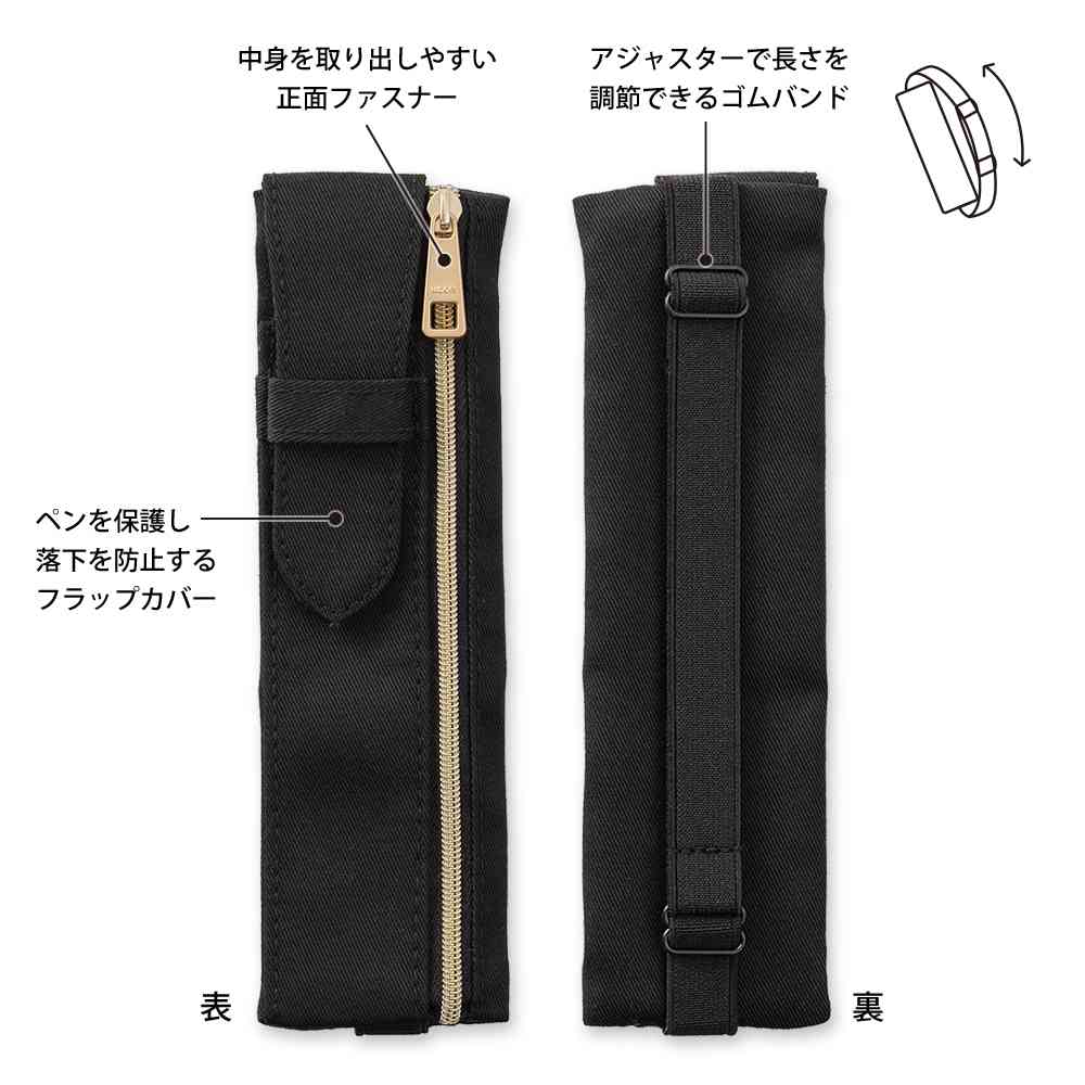手帳やノートの表紙に取り付けて、太軸のペンが最大4本持ち歩けるブックバンドペンケースです。 長さ調節できるアジャスター付きゴムバンドなのでB6~A5サイズの手帳やノートに対応できます。 風合いと耐久性を兼ねた綿とポリエステルの混合素材を採用し、伸縮性のある生地を使用しているので、使うほどペンポケットに差し込んだペンの形に馴染んでいきます。