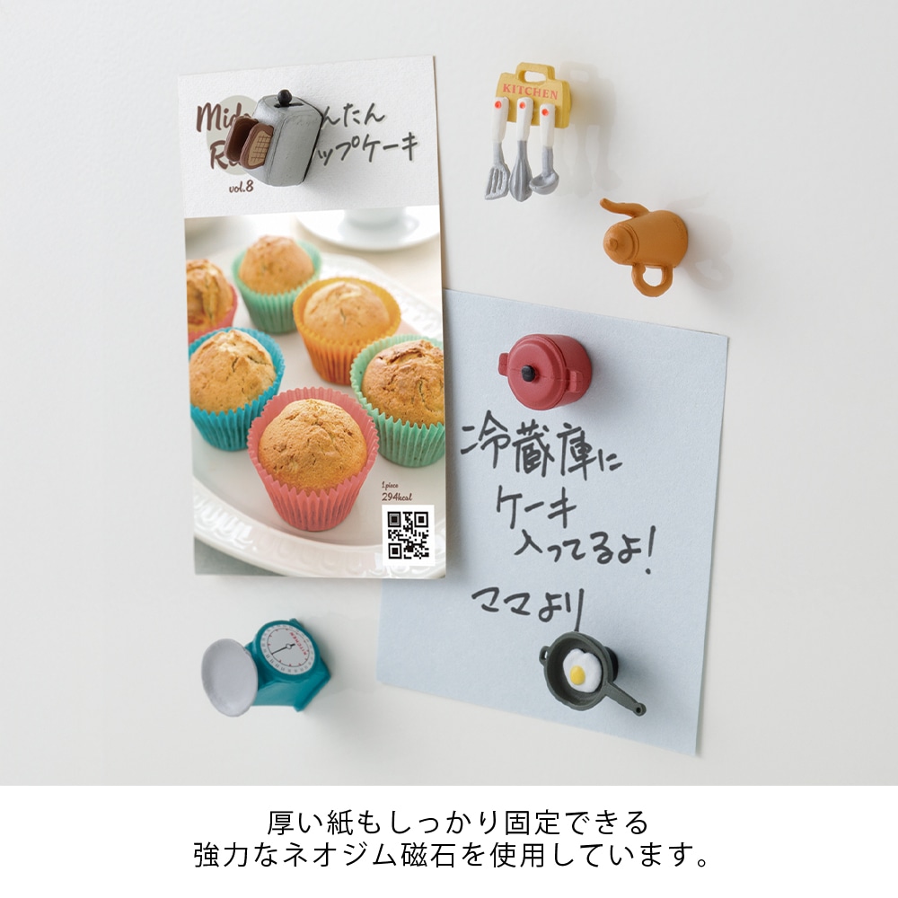 6種類のアイテムをアソートにした強力なマグネットです。お部屋のアクセントになるとともに、コレクションとして集めたくなるデザインです。キッチン用品をかわいいミニチュアサイズにしました。小さいながらも目盛りや持ち手などディテールまで丁寧に再現しました。