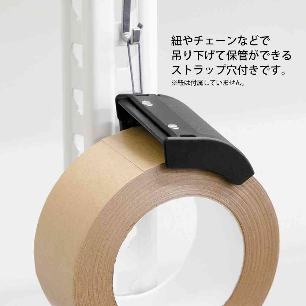 ガムテープを軽い力でキレイにカットできるコンパクトサイズのクラフトテープカッターです。 本体付属のクリップでガムテープへの着脱は簡単。 刃が露出していない安全な設計です。 紐やチェーンなどで引っ掛けて保管ができるストラップ穴も付いています。