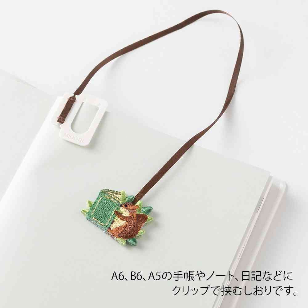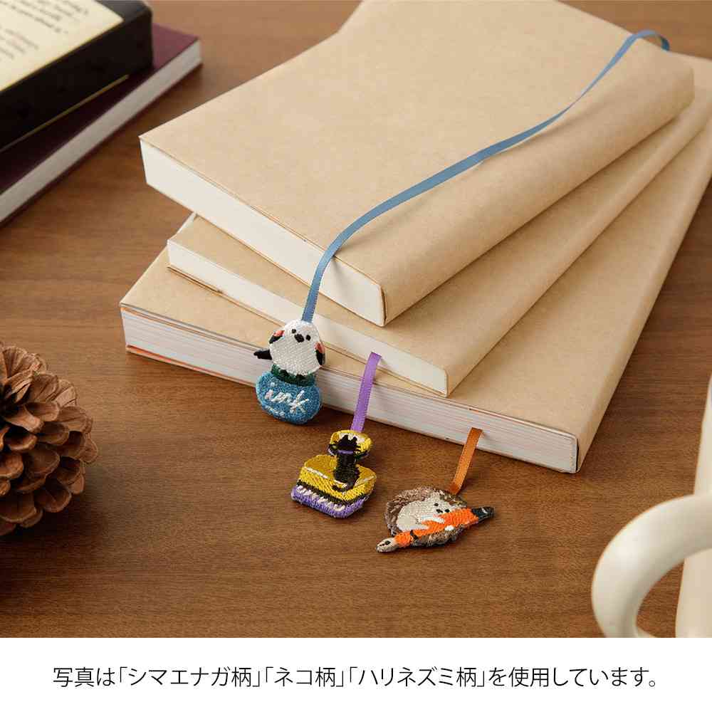 手帳や日記などにクリップで挟み込むだけで、かわいい刺繍チャームがついたしおりになります。 好きなモチーフでシンプルな手帳やノートを、カスタマイズして楽しめます。 クリップ部分にしおり紐を巻きつけることで長さを調整することができますので、挟む手帳やノートのサイズに合わせてお使いいただけます。
