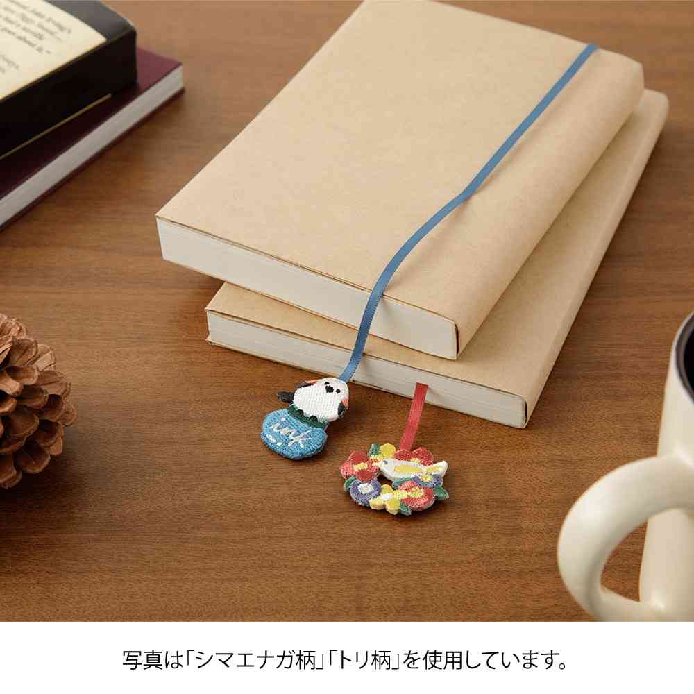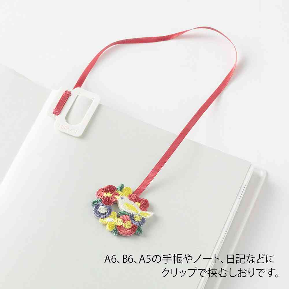 手帳や日記などにクリップで挟み込むだけで、かわいい刺繍チャームがついたしおりになります。 好きなモチーフでシンプルな手帳やノートを、カスタマイズして楽しめます。 クリップ部分にしおり紐を巻きつけることで長さを調整することができますので、挟む手帳やノートのサイズに合わせてお使いいただけます。