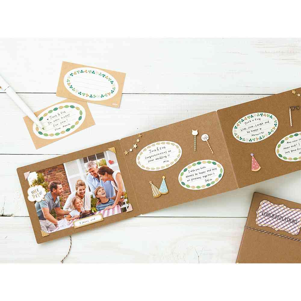 ギフトやアルバム、色紙などに使えるラベルシール。 寄せ書きなどメッセージを集めるときは、ミシン目部分で切って1人ずつに配ることができて便利です。