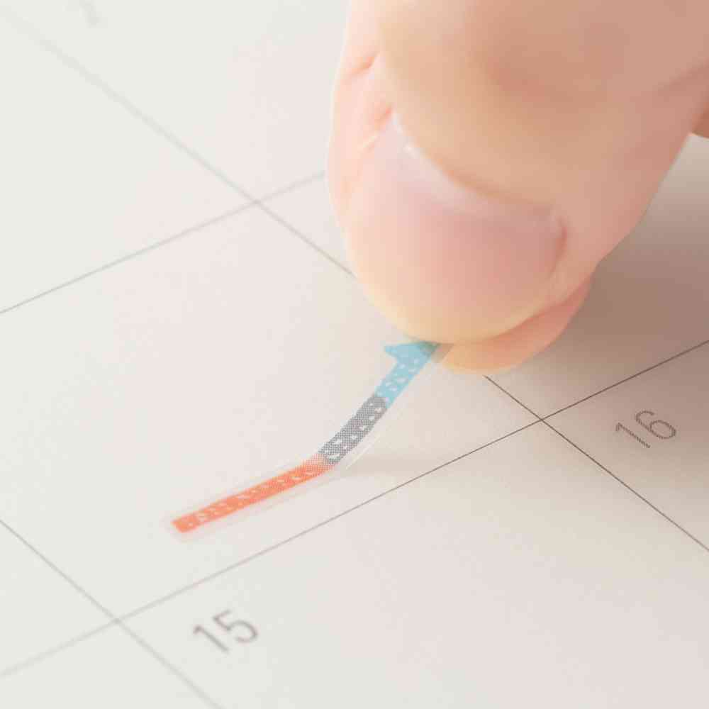 貼ってはがせる予定シール。 長期予定を見やすく管理するためのシールです。 横にも縦にも貼れるので、月間ページ、週間ページ、どちらにもお使いいただけます。色鉛筆の手描きタッチが優しいデザインです。 ミシン目入りで上下に2分割できるので、必要な分だけ携帯できます。