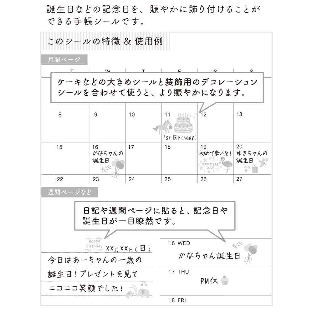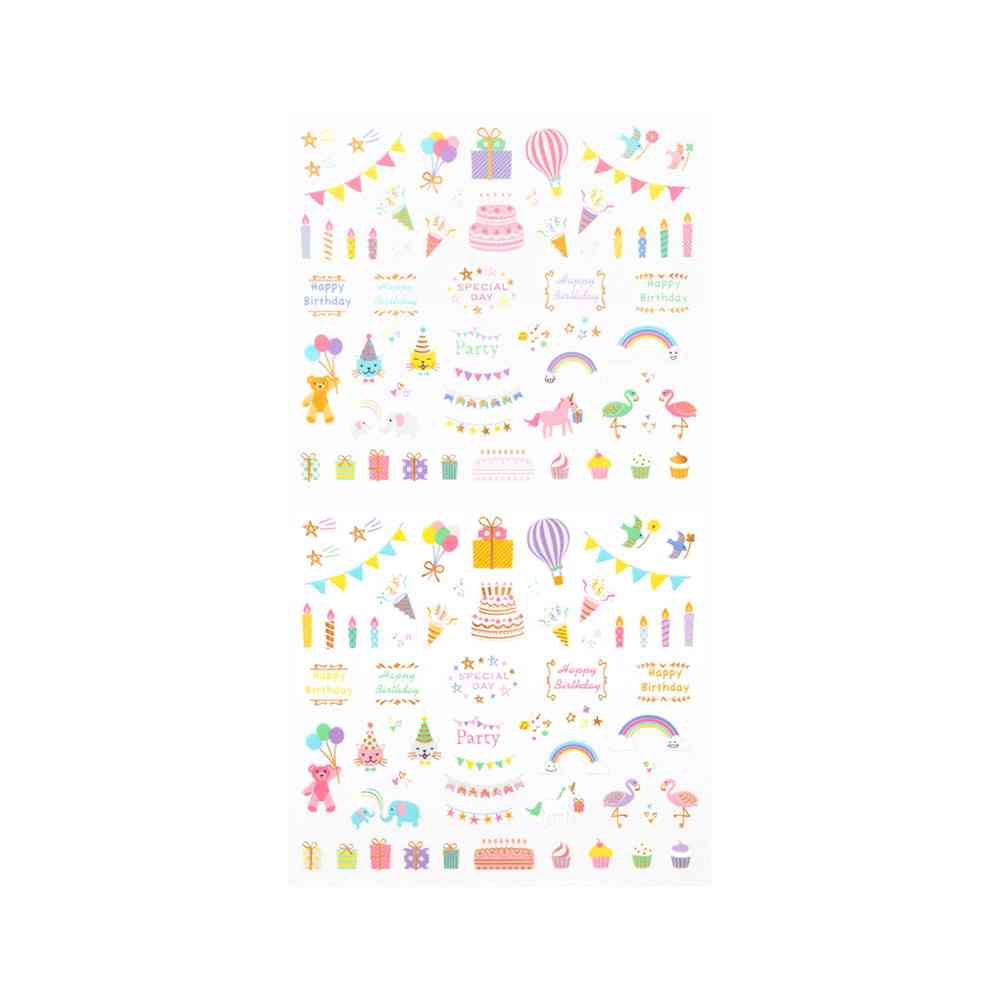貼ってはがせる記念日シール。 誕生日を賑やかに飾ることができる箔が華やかなシールです。 パステルカラーで動物もたくさんいるので、みんなの誕生日や記念日の記録にもお使いいただけます。 大きめのシールと装飾用のデコレーションシールを合わせて使うと、より賑やかになります。 ミシン目入りで上下に2分割できるので、必要な分だけ携帯できます。