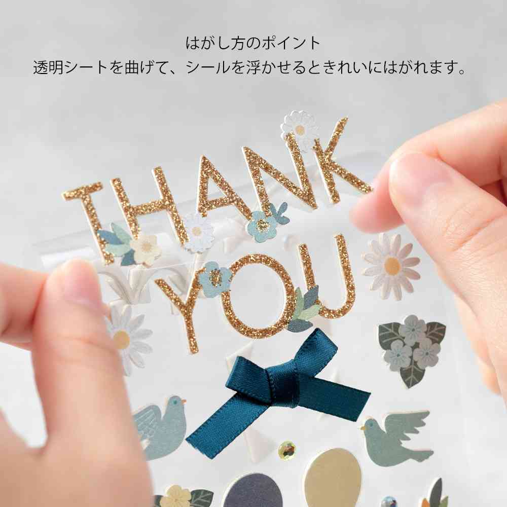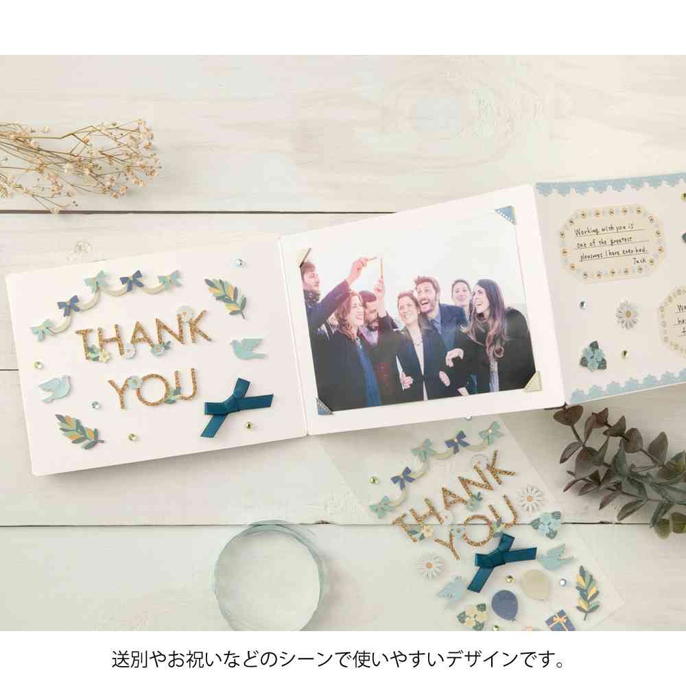 感謝のシーンを彩るタイトルシール。 1シート買うだけでアルバムや色紙のデコレーションが完成する手軽なシールです。 ラインストーンや本物のリボンが付いており、高級感があるので、先輩・上司に色紙を渡す色シーンなどにぴったりです。 文字自体もラメで華やかにデザインされています。 写真をとめるコーナーシールが付属されているので、写真と組み合わせてもお使いいただけます。