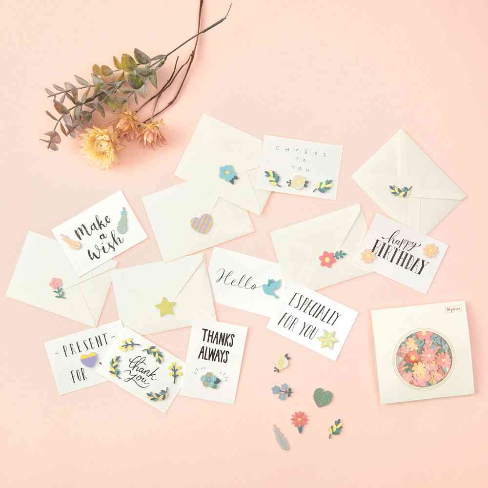 カードや色紙、ラッピングのデコレーションに使えるフレークタイプのシール。 定番の花モチーフをワントーンで揃えたカジュアルで色味が映えるデザインです。 スポンジシートが付いた厚みのある柔らかいシールを貼っていくと、箔やラメの輝きで華やかな印象になります。 タイトルシール(誕生日動物柄・ありがとう花柄)とも合わせやすい柄です。