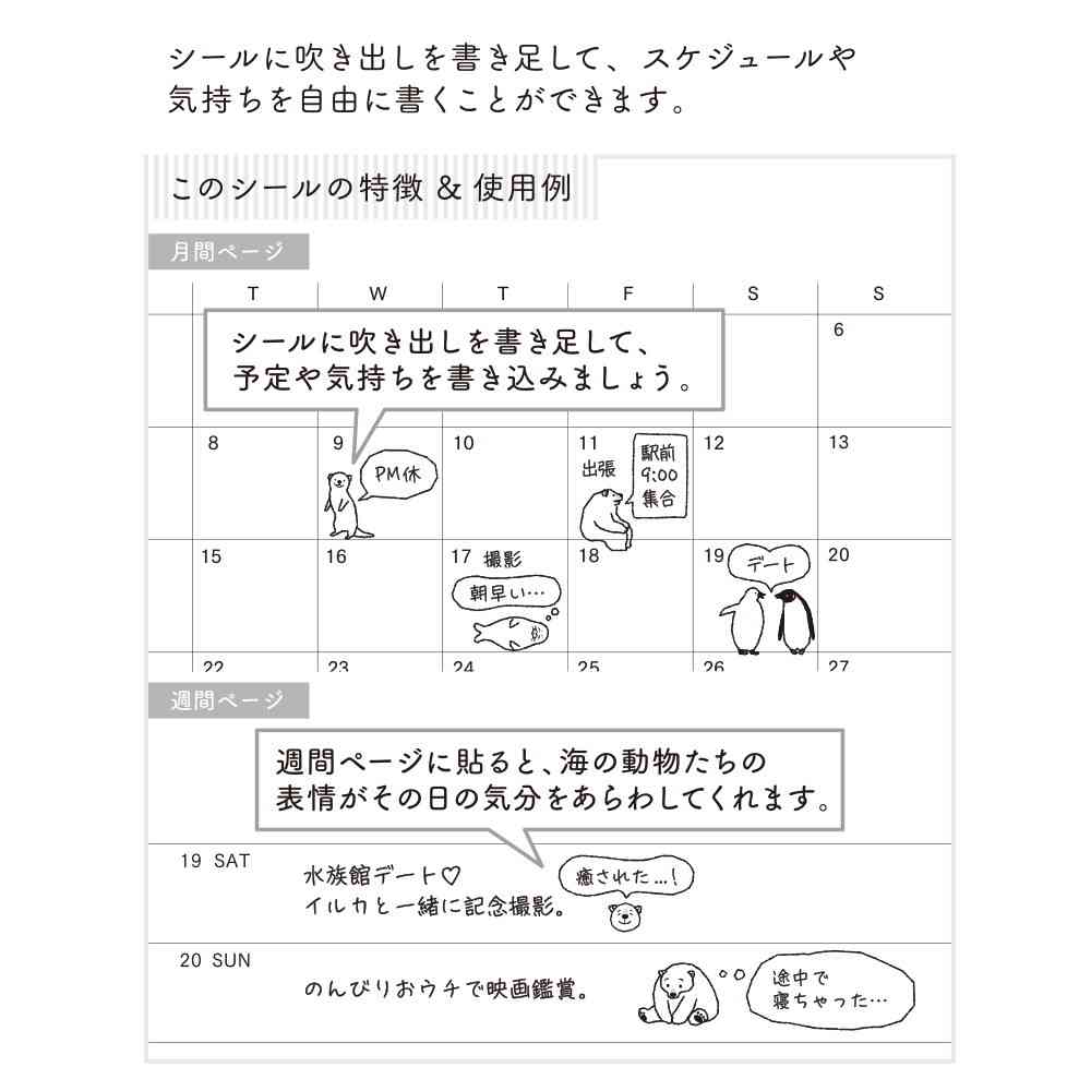 手帳の余白や日付を楽しく飾る、貼ってはがせるシールです。 ライン状に重ねて貼って、メモページの余白や見出しを賑やかに飾ることができます。 吹き出しを書き足した時になじみやすい、手書き風のデザインです。 つい吹き出しを書き足したくなる動物たちの表情がポイントです。