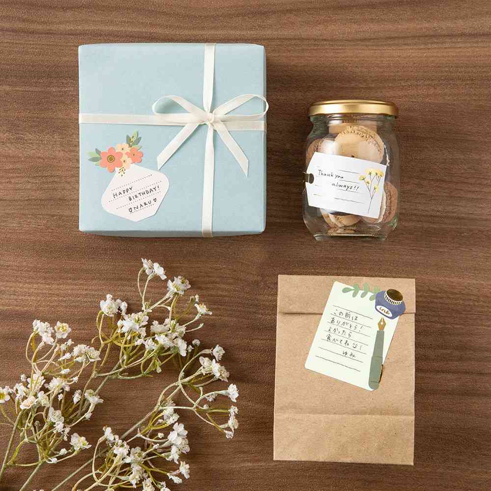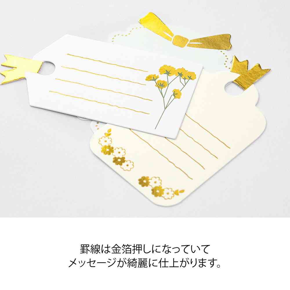 ギフトやアルバム、色紙などに使えるメッセージシール。 様々な形に抜かれたタグのデザインです。 罫線は金箔押しになっていてメッセージが綺麗に仕上がります。 寄せ書きなどメッセージを集めるときは1人ずつに配ることができて便利です。