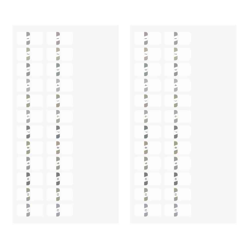 一般的なインデックスラベルでは手帳やノートからインデックスがはみ出すので、使用しているうちに傷んでしまう場合も。 そんな悩みを解決するのがインデックスラベル チラットです。 ページの端に貼ったときの飛び出しを、カバー付き手帳の内側に収まる2.5mmにすることで、インデックスを傷めることなくきれいに使うことができます。 利用頻度が高い1~12のナンバー入りを、トレンドのくすみカラーで彩りました。