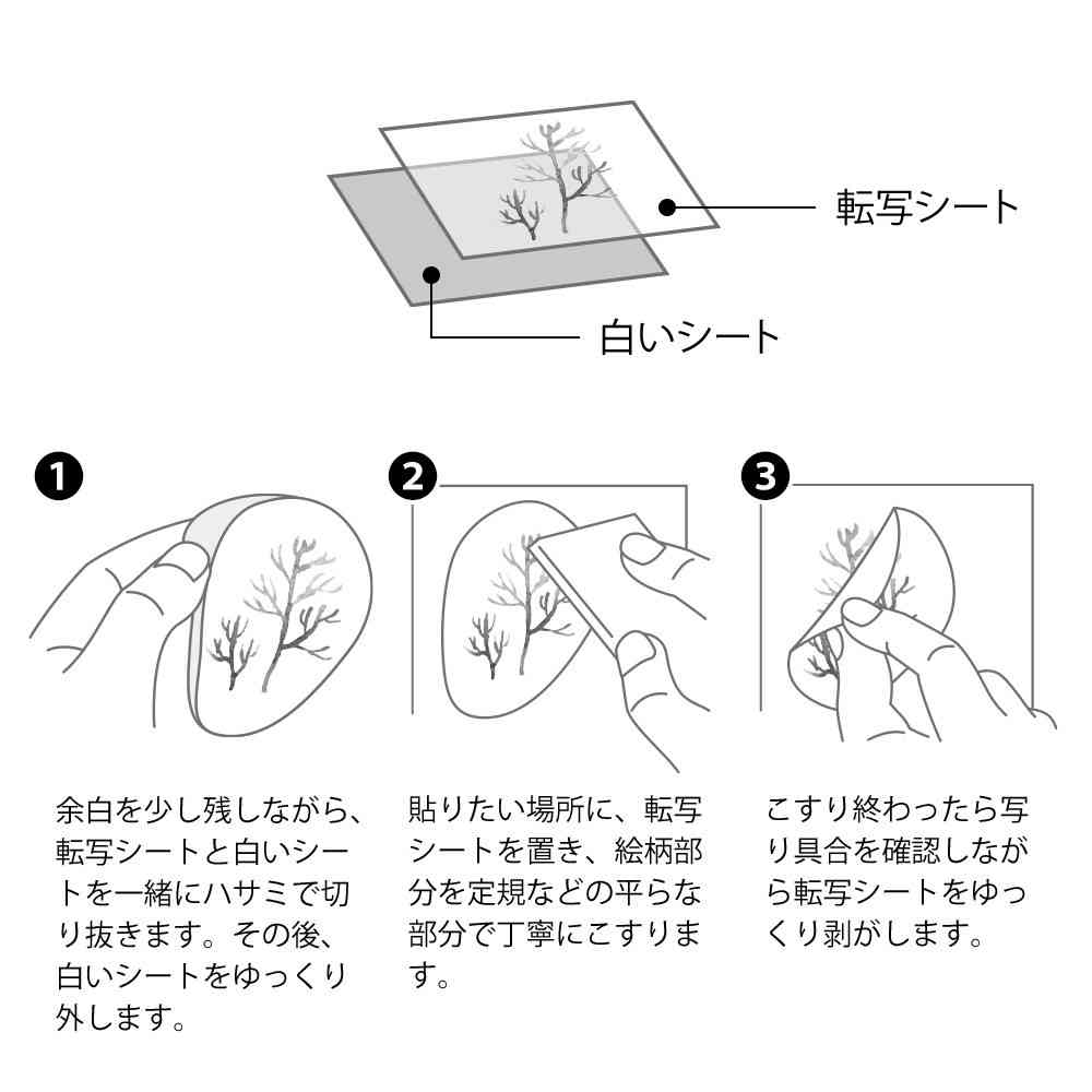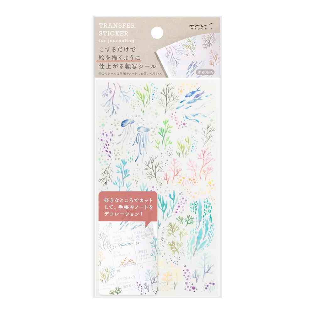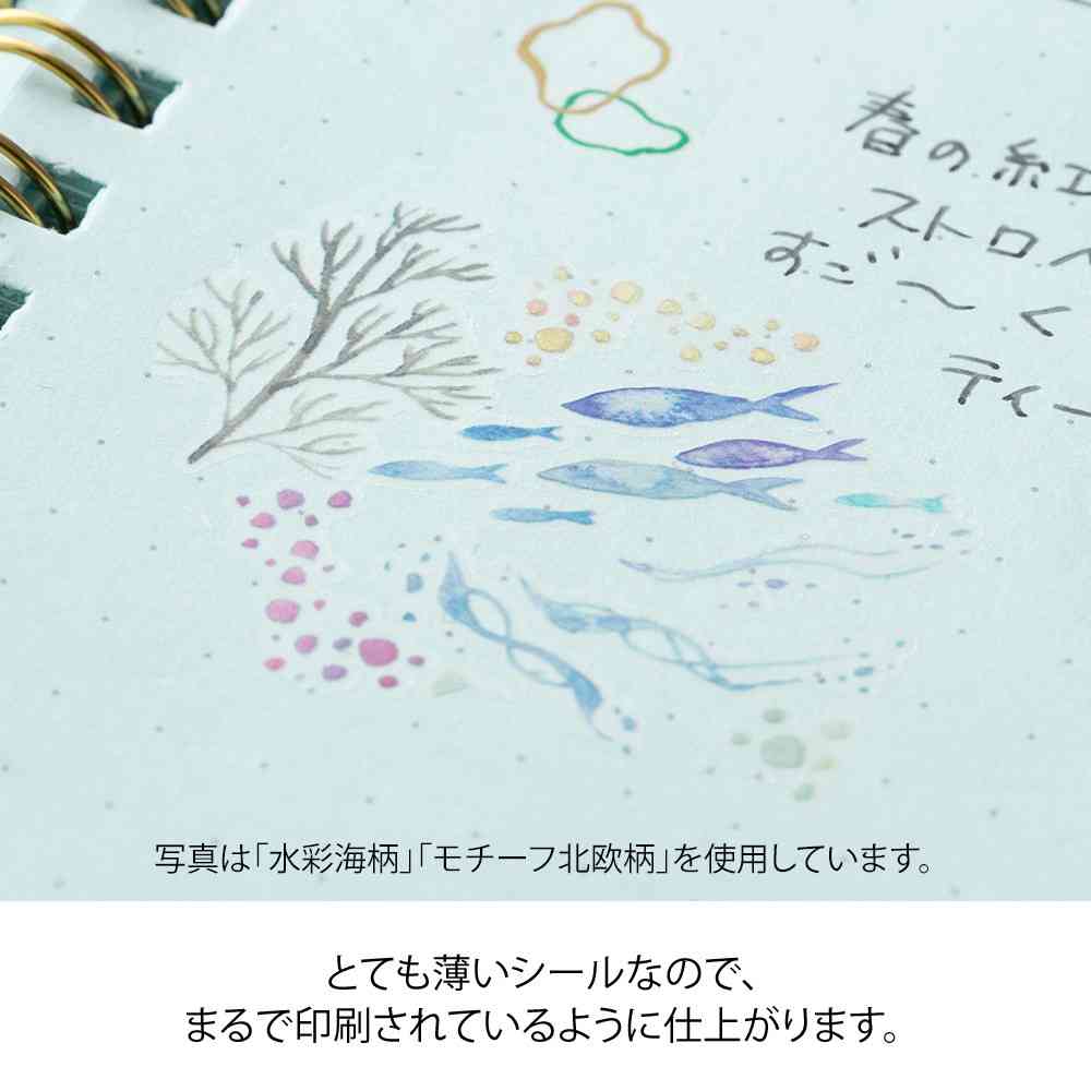 軽い力でこすると、絵を描いたように紙と一体化する転写タイプのシールです。 段差が全くできないので、転写したものに元から印刷されているような完成度になります。 どこから切っても使いやすい、やさしい水彩タッチの海中モチーフのデザインです。
