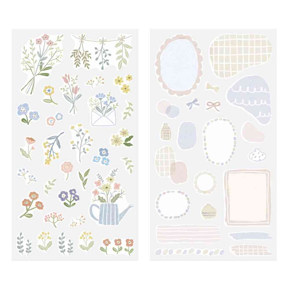 手帳、ノートのデコレーションを楽しむための、マスキングテープ素材のシールです。 半透明なので、重ねて貼ることで、より楽しいデザインができ上ります。 手帳に限らず、ライフログやノートのデコレーションにも使いやすい大きめのモチーフも入っています。 色鉛筆風の柔らかなタッチで描いた花柄です。 花のガーランドやブーケ、花瓶の絵柄と花を組み合わせると、お好きなアレンジメントが作れます。 2柄2枚入。