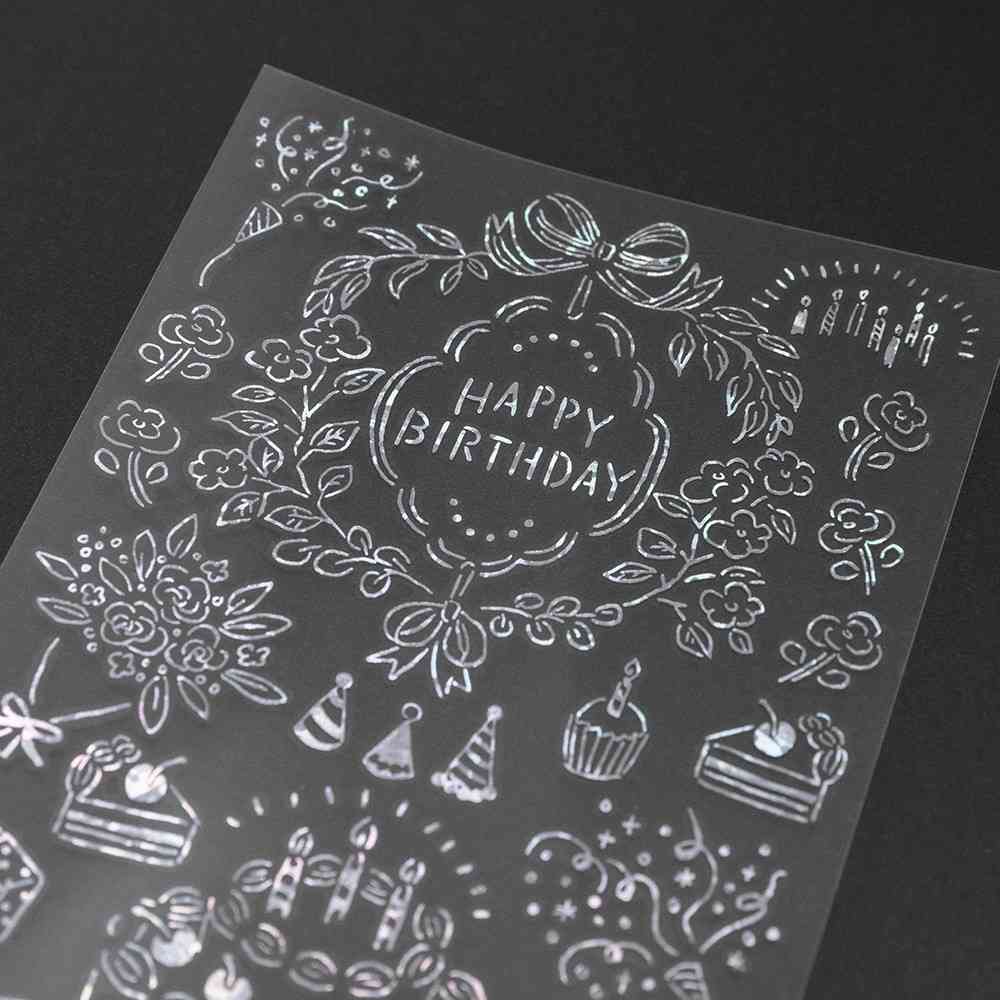 軽い力でこするだけで、ギフトカードや色紙にキラキラの箔押し加工ができる転写シールです。 段差が全く出ないので、まるで描いたかのように手書き風のメッセージやモチーフが紙と一体化します。 シートにはカットラインがないので、好きな部分だけを切り取ってご使用ください。 誕生日に添えるカードや手紙を彩るのにぴったりな、華やかなモチーフでまとめています。
